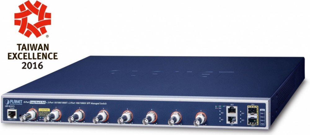 Koaxiální spravovatelný přepínač s 8 porty jako řešení prodloužení segmentů ethernet včetně zvětšení dosahu napájení PoE (power over ethernet) ze 100m až na 400m po koaxiálním vedení včetně zachování napájení IEEE 802.3at zařízení na konci vedení nebo až 1200m bez PoE napájení. Slave klientské extendery(LRP-101CE) lze řetězit/pospojovat až 4 jednotky na jednom injektor portu.