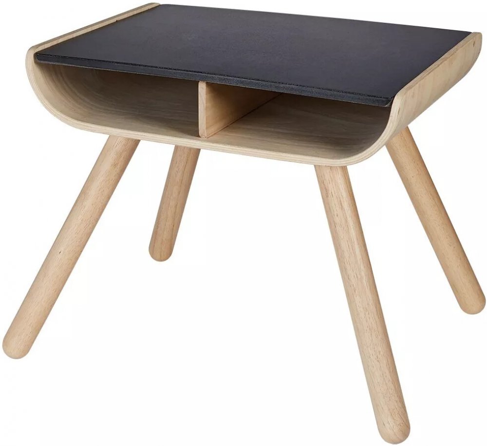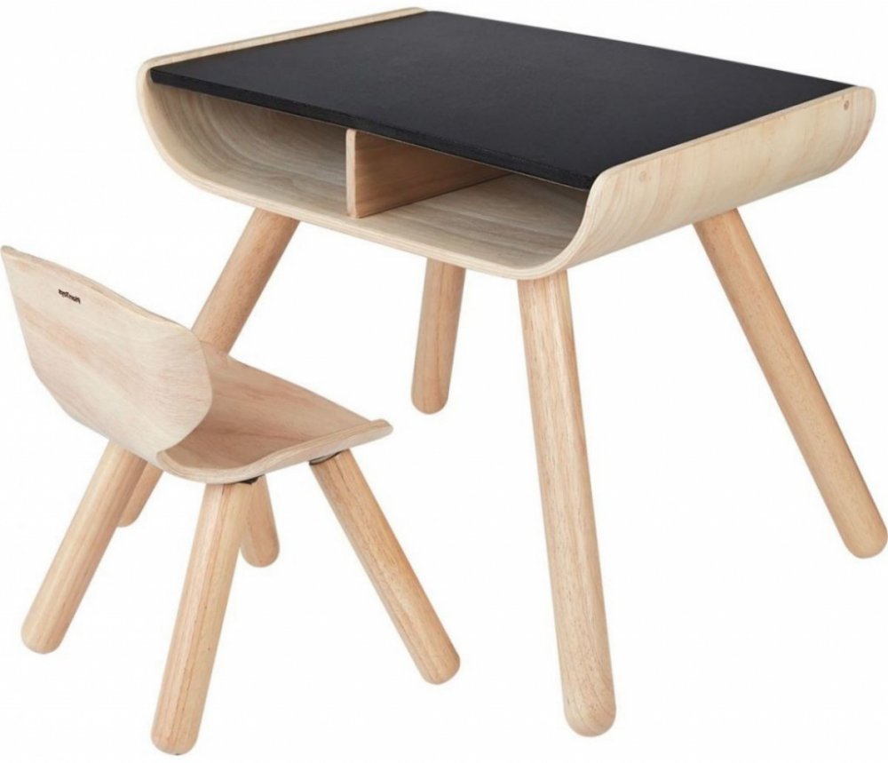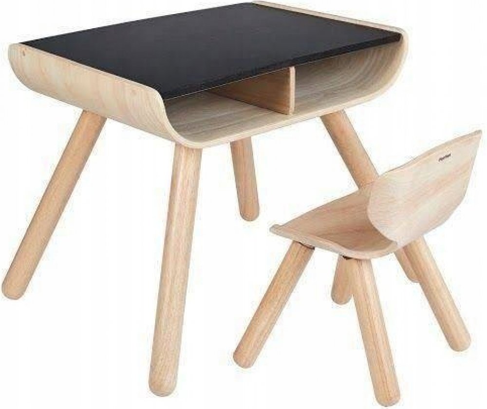 Dětský stolek je vyroben z masivního kaučukového dřeva. Horní deska stolku je z materiálu PlanWood a je organicky barvená černým pigmentem. Batolata mohou na desku kreslit křídou jako na tabuli a vytvořit si tak svůj vlastní imaginární svět. Desku je možné otírat vlhkým hadříkem.