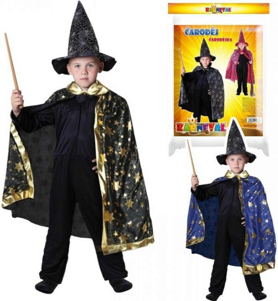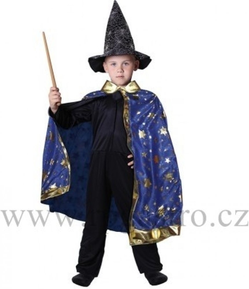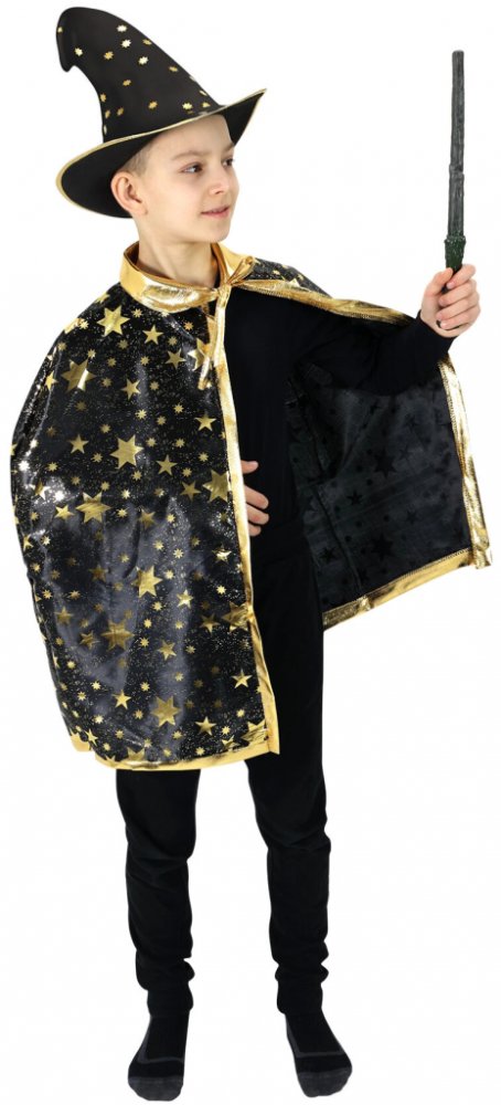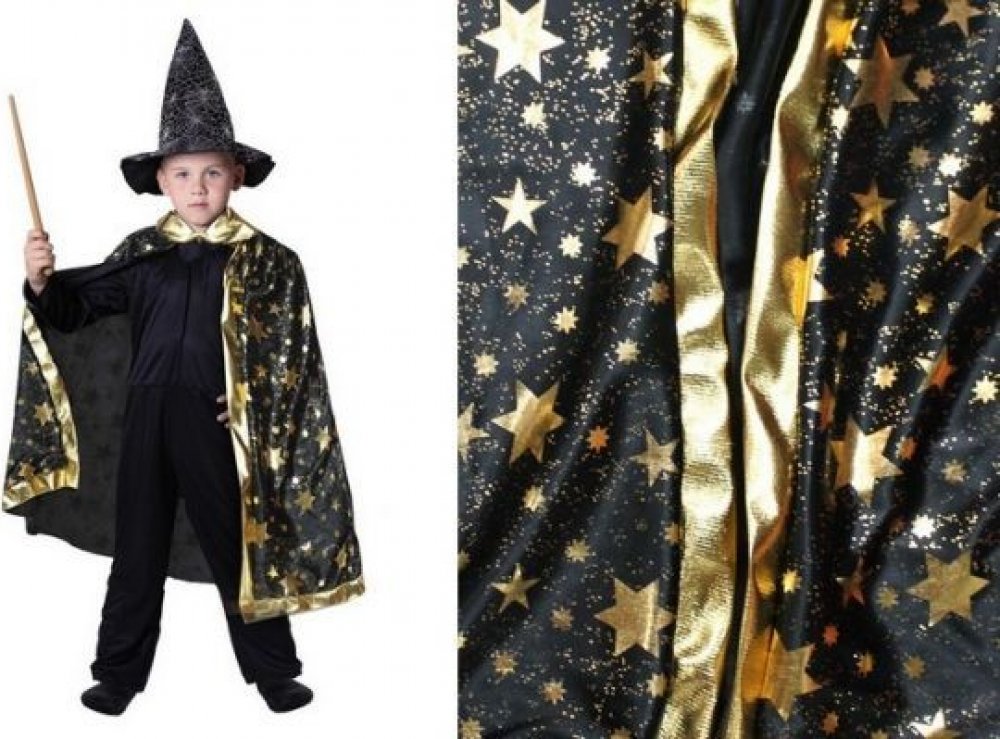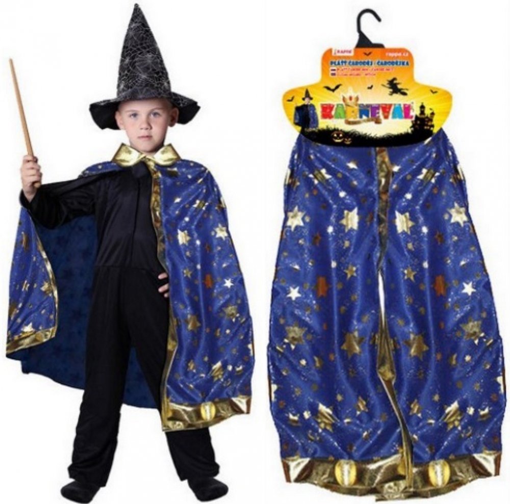 Kouzelný čarodějnický plášť! Tento magický kousek je určen pro všechny holky a kluky ve věkovém rozmezí 3-10 let (104-150 cm). Plášť na zavazování je dekorován zlatými hvězdičkami a lemováním.
