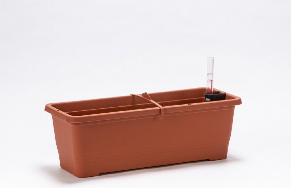 Plastia Bergamot samozavlažovací truhlík 50 cm - terakota 1909055003. Samozavlažovací truhlík jednoduchého, ale moderního vzhledu. Obsahuje ukazatel stavu vody v truhlíku a vyrovnávací nožičky, které pomáhají vyrovnat nerovnosti např. parapetu. Vyvinuto společně s profesionálními zahradníky.