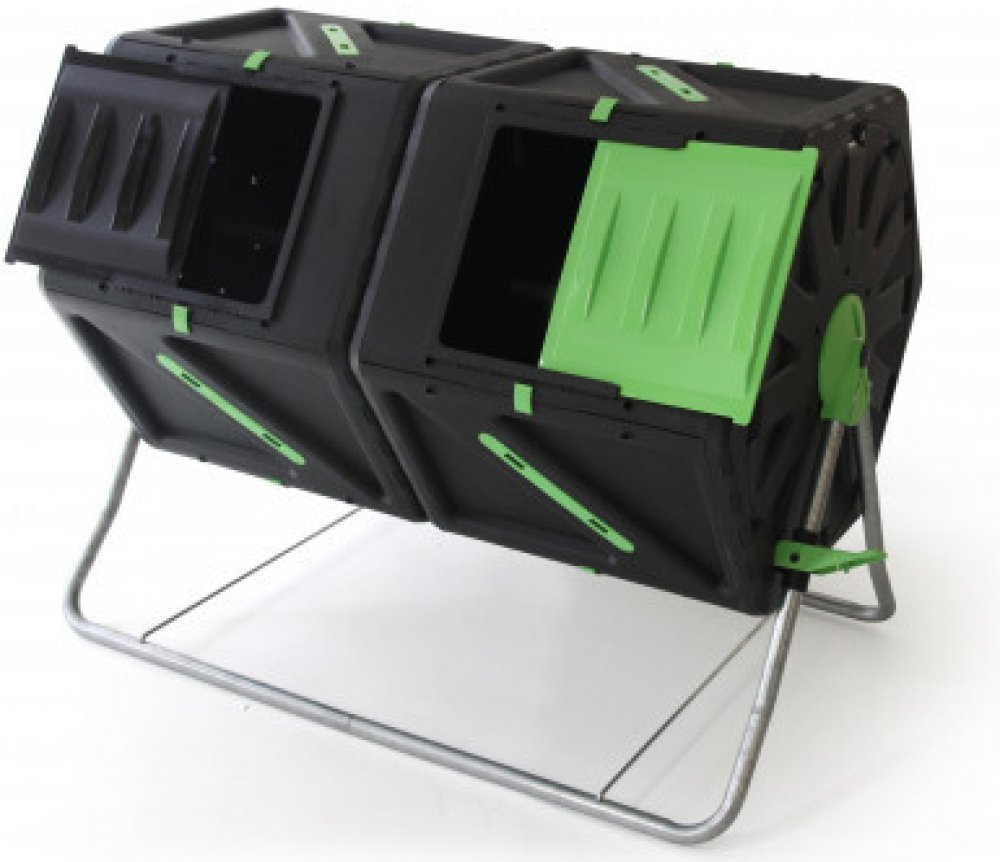 Bubnový kompostér s dvěmi komorami o objemu 2 x 150 l je skvělým pomocníkem pro efektivnější využití odpadu z domácnosti a zahrady. Obsahuje mechanismus s žebry, která mísí a rozbíjí větší shluky materiálu tak, aby aktivovaly a urychlily proces rozkladu. Takové kompostéry jsou schopny dosáhnout teploty více než 60 °C a společně s provzdušňovacím systémem urychlí proces kompostování. Vysoce trvanlivá konstrukce pro všechna roční období s ochranou před UV zářením zaručuje celoroční kompostování. Bubny kompostéru s posuvnými dvířky jsou opatřeny kovovým stojanem s dvěmi zarážkami pro pohodlné používání a stabilitu.Sestavení kompostéru je velmi snadné.