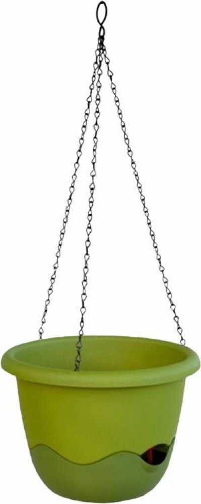 Samozavlažovací květináč s kovovým řetízkem na zavěšení.