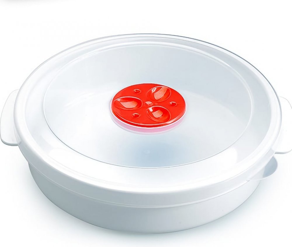 Dóza/hrnec do mikrovlné trouby objem 2l, rozměry: průměr 33,5cm, výška 7cm, materiál plast. Vynikající pro rychlé rozmrazování, ohřívání i vaření v mikrovlnné troubě a pro ukládání pokrmů v mrazničce nebo ledničce.Na víku má hrnec otočný uzávěr pro odvod páry.