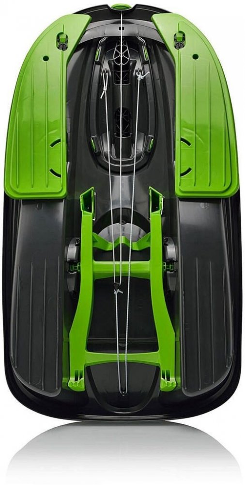Stylový design závodní formule. Středová brzda pro větší bezpečí. Originální provedení se čtyřmi lyžinami. Zaručuje snadné zatáčení. Zatáčení pomocí diferenciálu zvyšuje rychlost v zatáčkách, protože každá lyže může zatočit pod jiným úhlem. Samonavíjecí mechanismus tažného lana. Masivní brzda s pružinou pro navrácení do původní polohy. Žádné kovové prvky ani šrouby,...