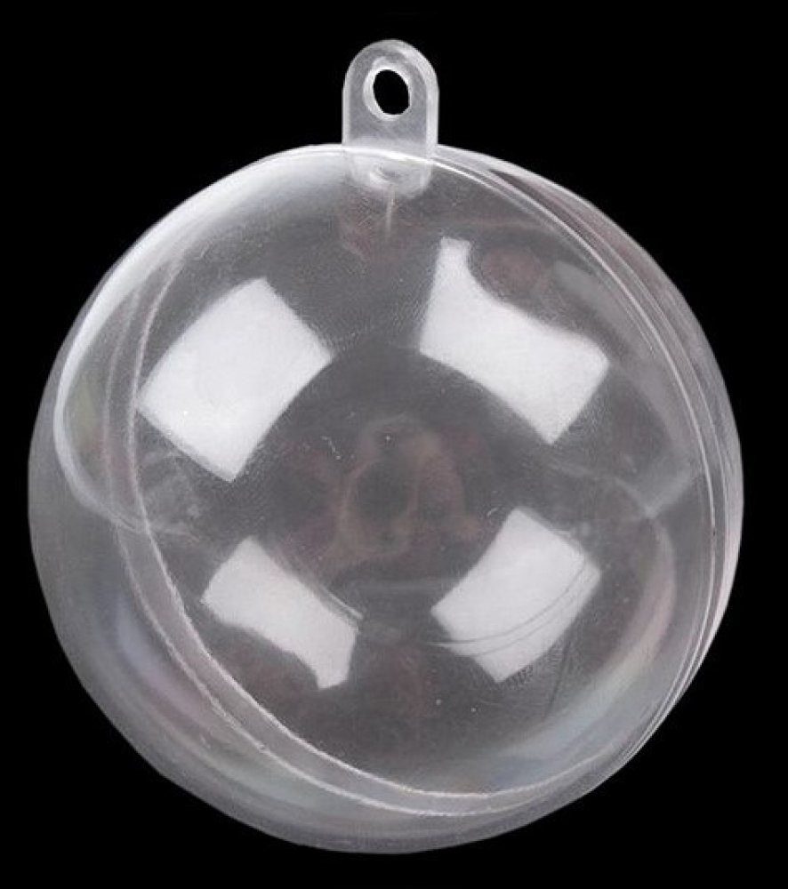 Průhledná plastová koule se skládá ze dvou dílů, které lze spojit a pomocí očka zavěsit jako dekoraci. Je určena k dalšímu dozdobení např. ji můžete obháčkovat, dekorovat metodou quilling, ubrouskovou technikou, dozdobit glitry atd. Fantazii se meze nekladou.