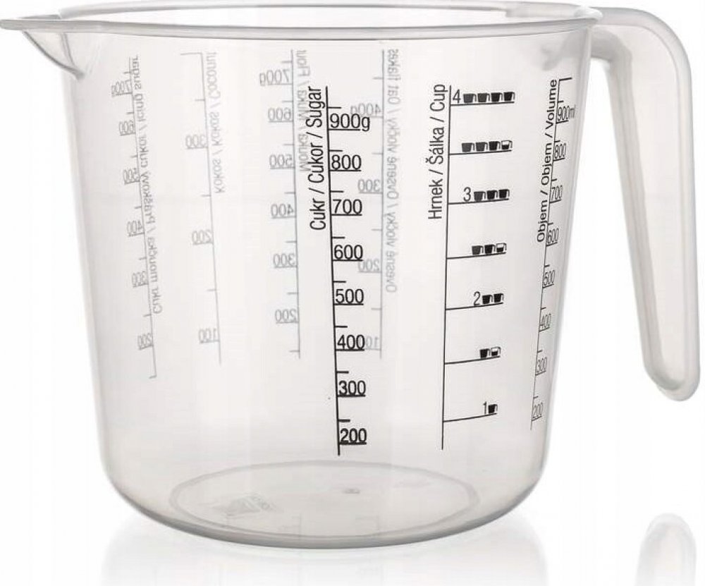 Plastová odměrka o objemu 1 l je vhodná pro odměřování sypkých i tekutých potravin díky přehledným stupnicím. Odměrka je opatřena stupnicí na kokos, ovesné vločky, mouka, cukr moučka, cukr a objem v ml nebo na šálky. Rozměry: 18,7 x 13,1 x 12 cm