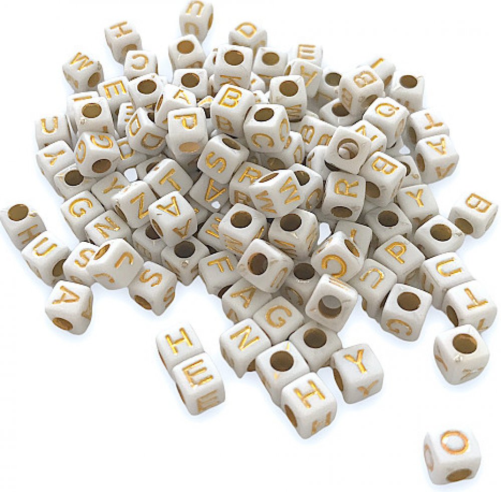 Plastové korálky kostky bílé 20g - zlatá abeceda
