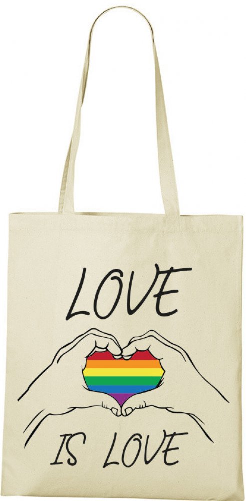 Plátěná taška s potiskem Love is love. S touto plátěnou taškou můžeš jednoduše a stručně vyjádřit podporu LGBT, ale i to, že do ní patříš a nestydíš se zato. Plátěná taška je skvělým dárkem na narozeniny či Vánoce. Ukaž všem, že máš srdce na tom pravém místě s touto plátěnou taškou. Plátěná taška má vkusný a decentní motiv.