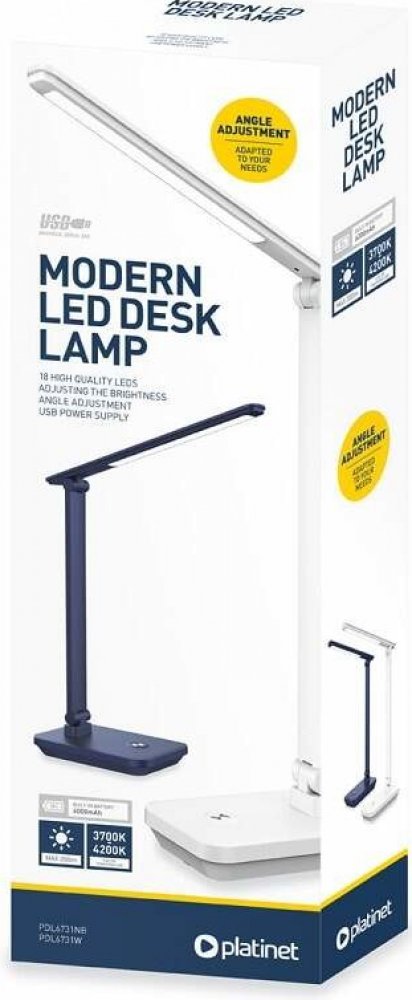 Moderní stolní lampa PDL6731 s integrovaným LED modulem je ideální volbou pro pracovní i odpočinkové prostředí. Díky vestavěné baterii s kapacitou 6000 mAh můžete lampu pohodlně používat i tam, kde není k dispozici elektrická zásuvka. Na jedno plné nabití, které trvá přibližně 14 hodin, nabízí až 8 hodin nepřetržitého svícení. Nabíjení probíhá skrze standardní Micro USB kabel, který je součástí balení. Lampa je vyrobena z lehkého, ale pevného plastového materiálu a její čistý modrý design doplní moderní interiéry domácností i kanceláří. Model je nabízen v bílém, černém a modrém provedení. Dotykové ovládání umožňuje plynulé nastavení intenzity světla podle aktuálních potřeb. Světlo v rozmezí 3700–4200 K (denní bílá) je dostatečně neutrální, aby neunavovalo oči a zároveň podporovalo soustředění. Výkon LED zdroje činí 5 W, což odpovídá zhruba klasické 15W žárovce. Lampa dosahuje světelného toku 200 lumenů, což postačuje pro běžné úkoly jako je čtení nebo práce na notebooku. Adaptér není součástí balení. Napájecí kabel je součástí balení. Napětí napájení je 5V/1A. Lampa je vybavena vestavěnou LED technologií – není potřeba dokupovat žárovku. Lze používat i bez připojení k zásuvce – ideální na cesty nebo při výpadku proudu. Lampa je vybavena USB portem na nabíjení telefonu nebo jiného zařízení. Možnost nastavení intenzity světla (stmívání).