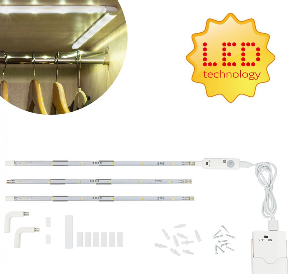 Obsah sady:3 LED lišty, 2x rohový konektor, pohybový detektor s časovačem (doba svitu 1 min nebo 30 sec), krabička na baterie, instalační materiál