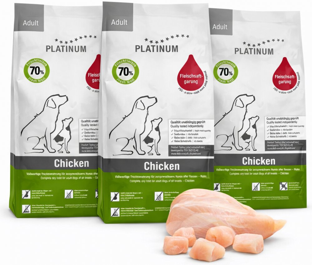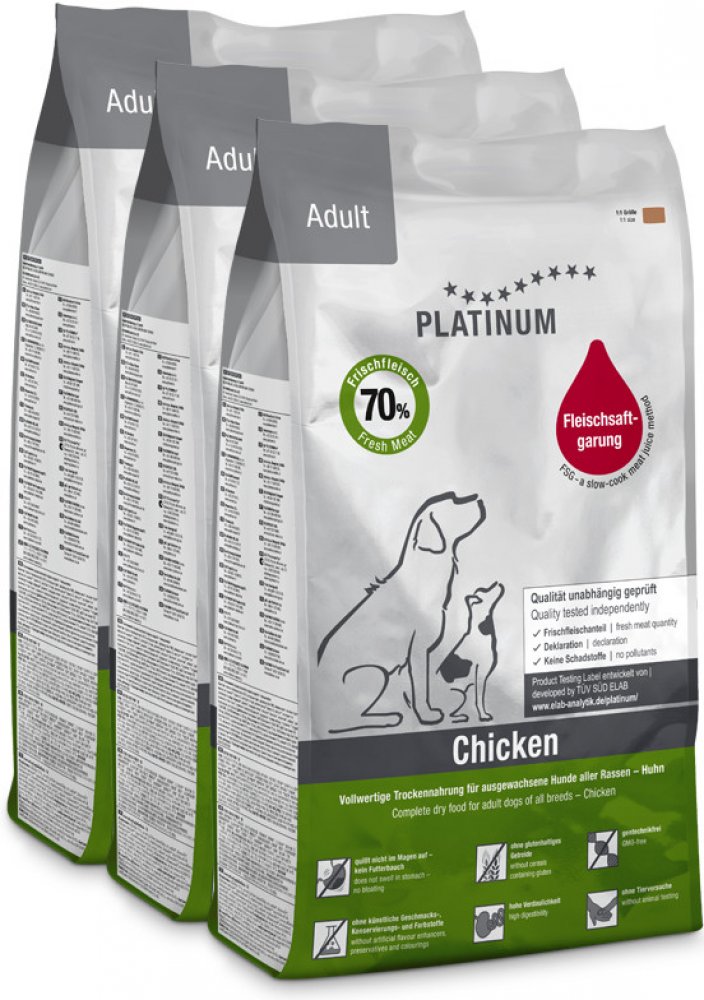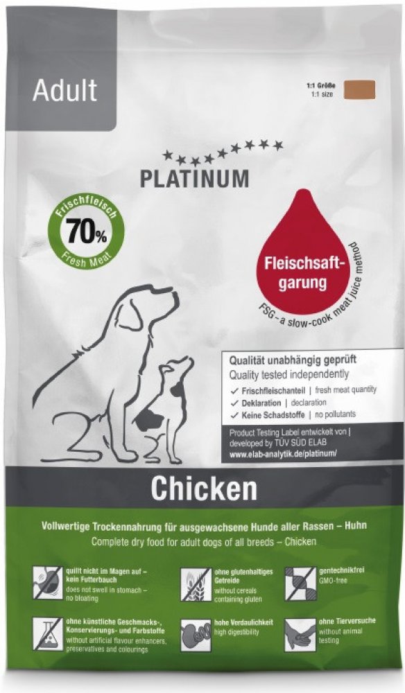 PLATINUM ADULT CHICKEN je díky svému přírodnímu a jednoduchému složení snadno stravitelné. Neobsahuje nežádoucí látky, které by zbytečně zatěžovaly organismus Vašeho psa. PLATINUM ADULT CHICKEN vyhovuje nutričním požadavkům aktivních dospělých psů. Je vhodné i pro psy v extrémní pracovní nebo sportovní zátěži. Umožňuje psům dosahovat maximálního možného rozvoje kondice, především síly a rychlosti. PLATINUM ADULT CHICKEN zajišťuje dlouhodobě pevné zdraví a vitalitu.