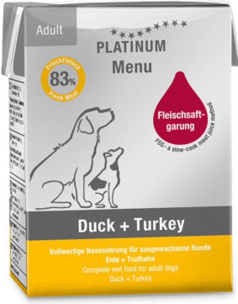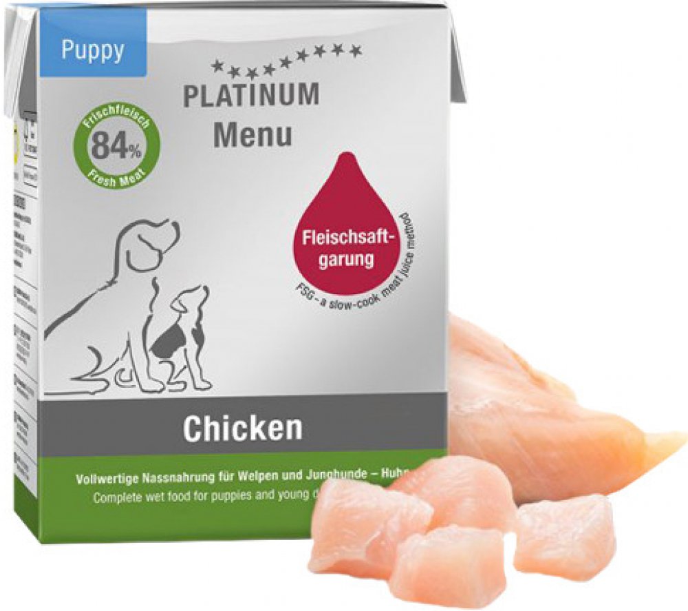 Platinum Menu je připraveno metodou Fleischsaftgarung Za použití metody FSG je čerstvé maso vařeno ve vlastní šťávě bohaté na živiny, stejně jako v kuchyni. Naše Platinum Menu je připravováno technikou krátkého vaření. Tato technika lze být použita pouze díky kartonu Tetra Recart, jelikož je umožněno dosáhnout požadované teploty uvnitř obalu rychleji než u běžné konzervy.