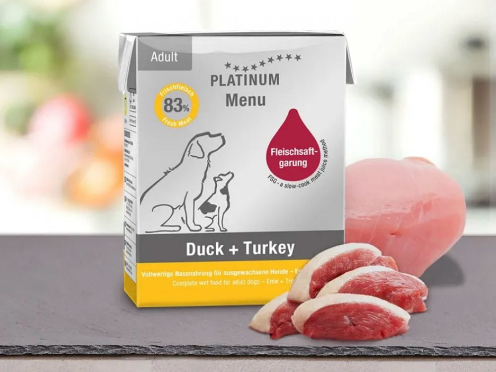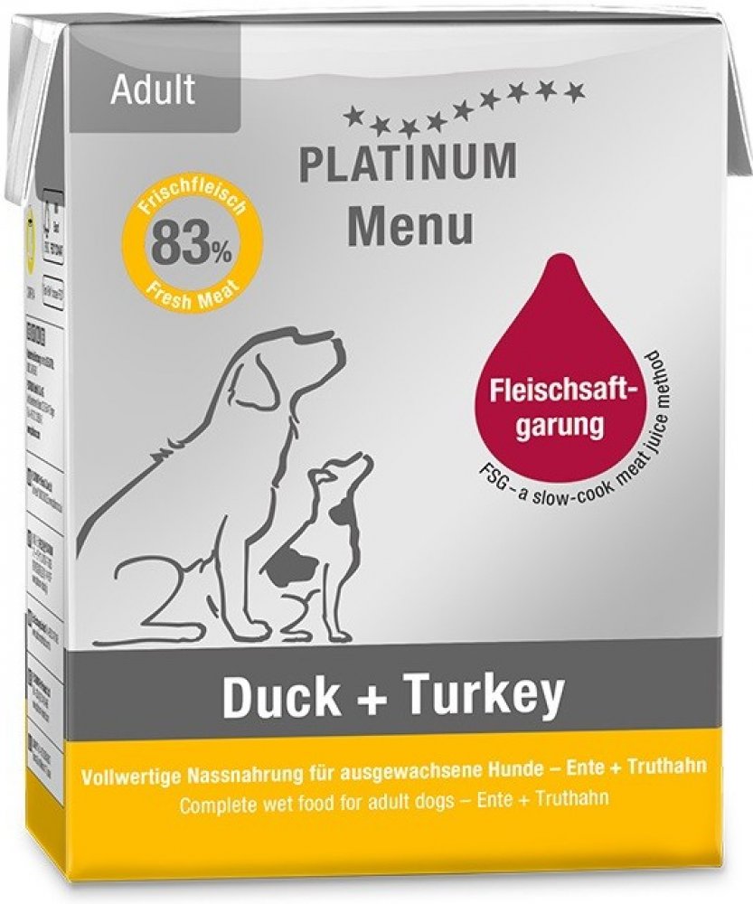 Paštika Platinum Menu Adult Duck + Turkey obsahuje 83 % čerstvého drůbežího masa z kachny a krocana. Díky jedinečné metodě přípravy Fleischsaftgarung si maso uchová plnou chuť, vůni a všechny důležité živiny. Přísady se pomalu vaří za nízkých teplot uzavřené v obalu Tetra Recart. Všechna šťáva tak zůstane uvnitř, včetně vitamínů a minerálů. Receptura s vyváženým složením vyhovuje i psům s citlivým...