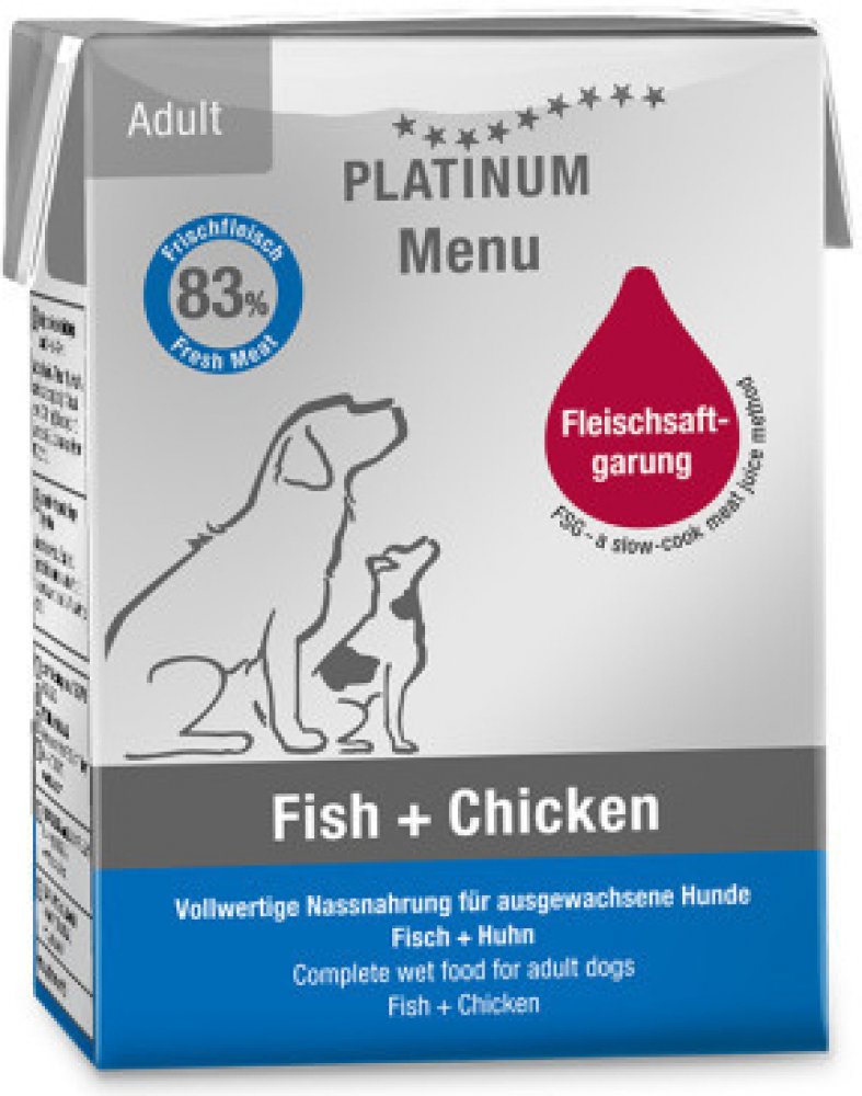 Paštika Platinum Menu Adult Fish + Chicken obsahuje 83 % čerstvého kuřecího a rybího masa z tuňáka a sardinek. Díky jedinečné metodě přípravy Fleischsaftgarung si maso uchová plnou chuť, vůni a všechny důležité živiny. Přísady se pomalu vaří za nízkých teplot uzavřené v obalu Tetra Recart. Všechna šťáva tak zůstane uvnitř, včetně vitamínů a minerálů. Receptura s vyváženým složením vyhovuje i psům ...