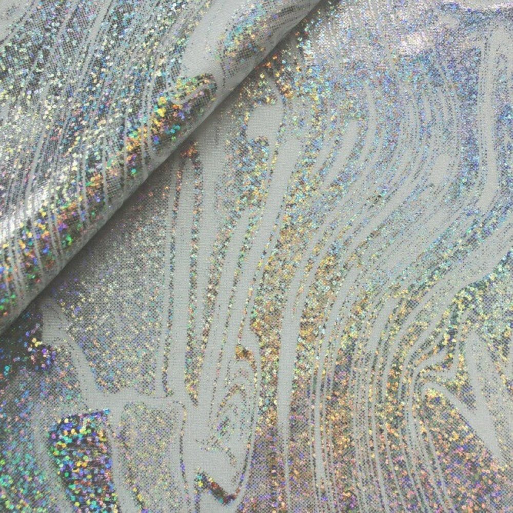 Kvalitní elastický úplet s jednotným základem, na jehož povrchu se střídají efekty stříbrných třpytek, které dodávají výrazný lesk. Látka od evropského výrobce, se složením 80% polyamid a 20% elastan, s gramáží 204 g/m2. Plavkovina je vhodná pro taneční kostýmy, plavky, bikiny, legíny, trikoty, body a šaty.
