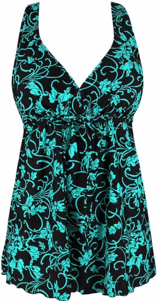 Plavky typu tankini užijete u vody i doma na zahrádce. Horní díl prodlouženého topu zakrývá oblast břicha a zamaskuje i drobné nedokonalosti postavy. Pod prsy je šňůrka a výztuž lze opakovaně vyjímat. Plavkové tílko na ramínka se střihem do písmene "A" Ramínka jsou pevně přišitá, délku si můžete upravit Šířka ramínek je v nejužším místě 1,5 cm Vpředu výstřih do písmene "V" Košíčky jsou zdvojené, b...
