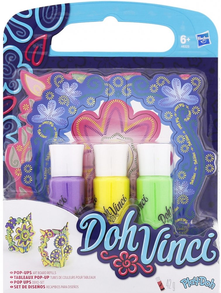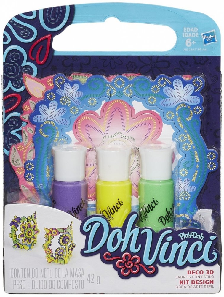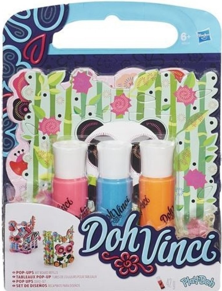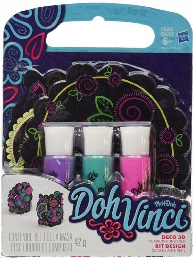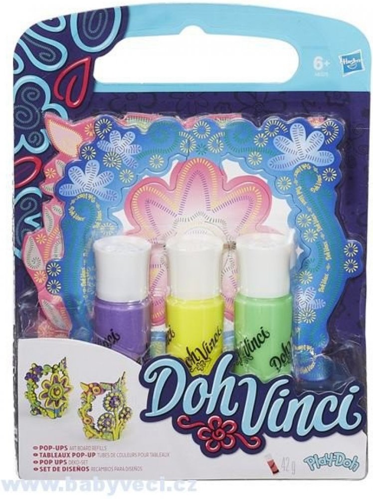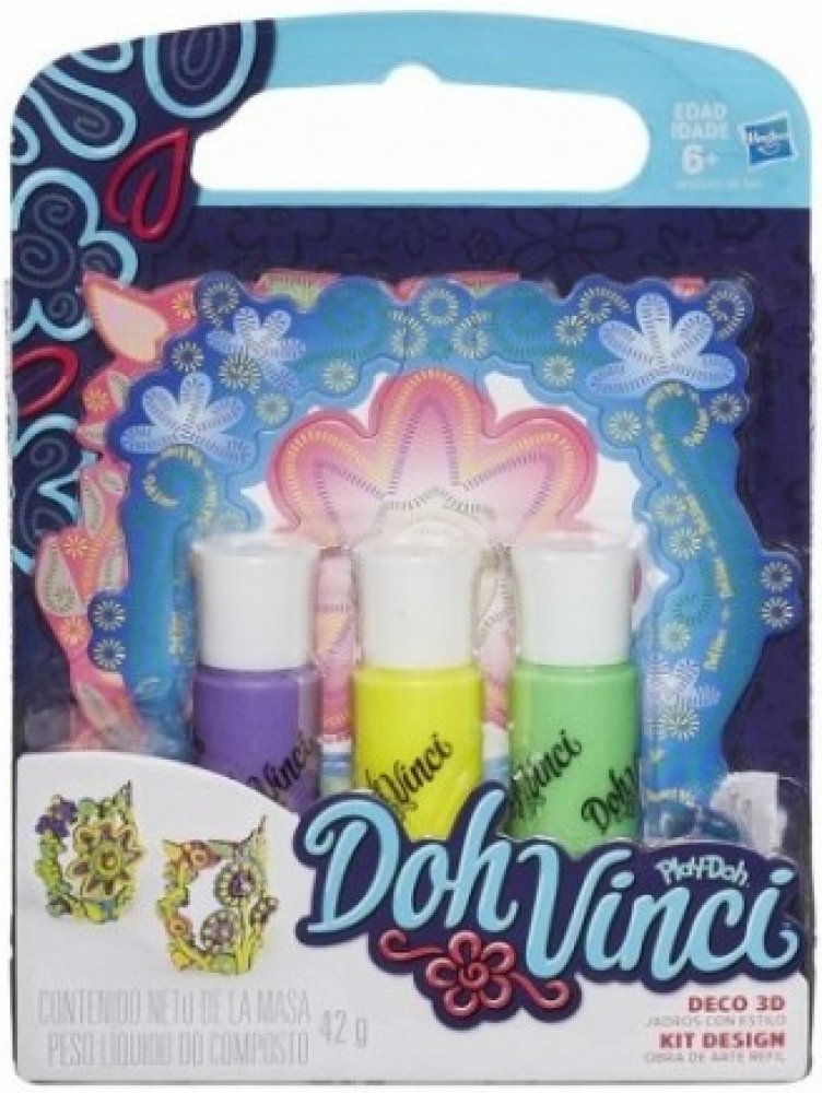Dekorování s Play-Doh Vinci představuje kreativní kratochvíli pro děti od 6 let. Díky kreativním deskám však dekorování dostává zase o něco zajímavější rozměr. Kreativní deska dává spoustu prostoru k realizování dalších nápadů. Hotový výtvor pak může posloužit jako originální dárek či krásná památka. Součástí balení jsou dvě kreativní desky a tři tuby Doh-Vinci. Sada je vyráběna ve více barevných provedení, dodáváme ji však dle aktuálních skladových zásob. Specifikace: Obsah sady: 2 kreativní desky 3 náhradní tuby Doh Vinci Doporučený věk: 6+ Hračka splňuje směrnice Evropského parlamentu a Rady 2009/48/ES ze dne 18. června 2009 o bezpečnosti hraček a všechny zákonné normy dle české legislativy. Samozřejmostí je prohlášení o shodě CE.