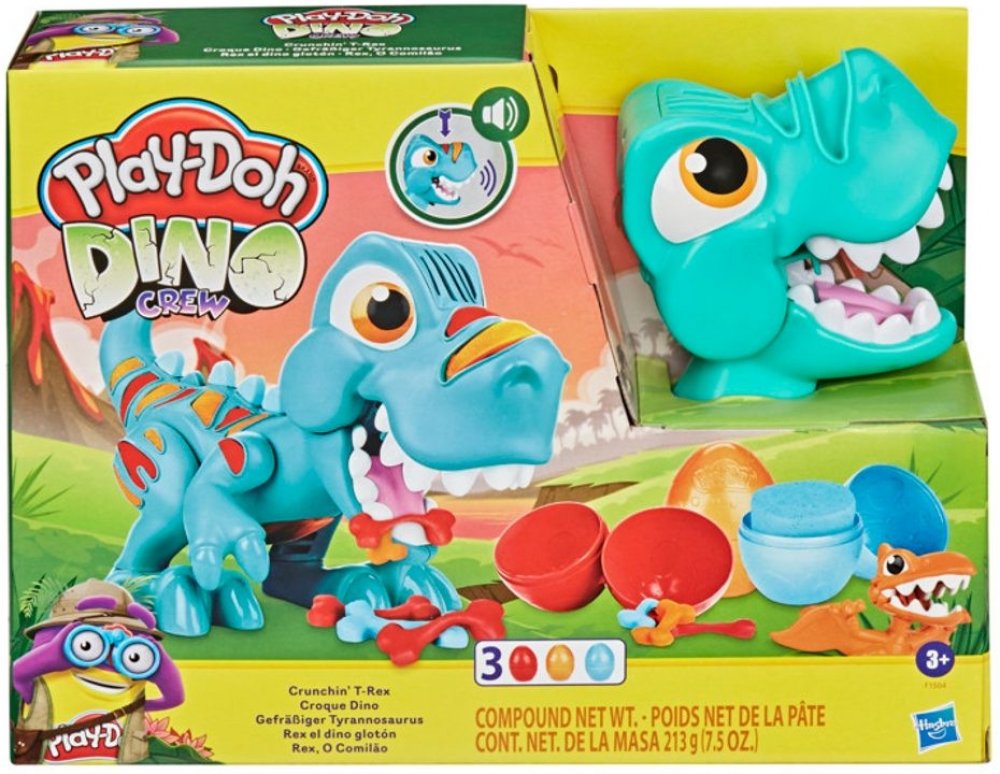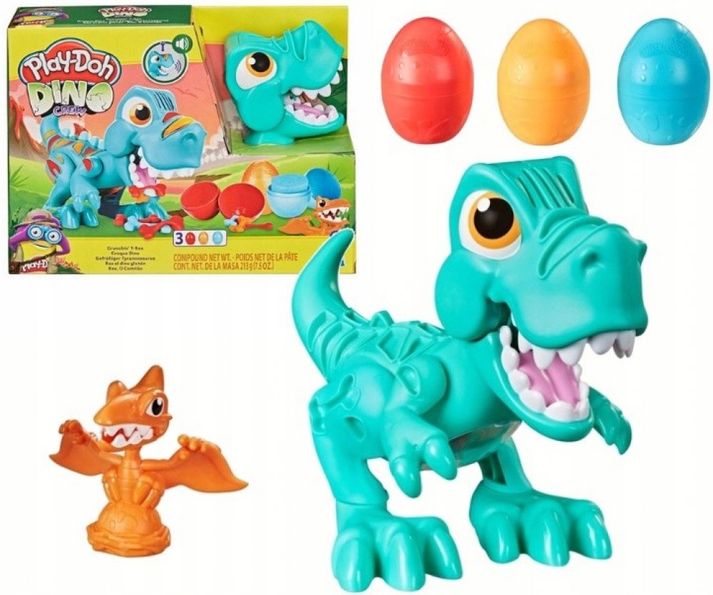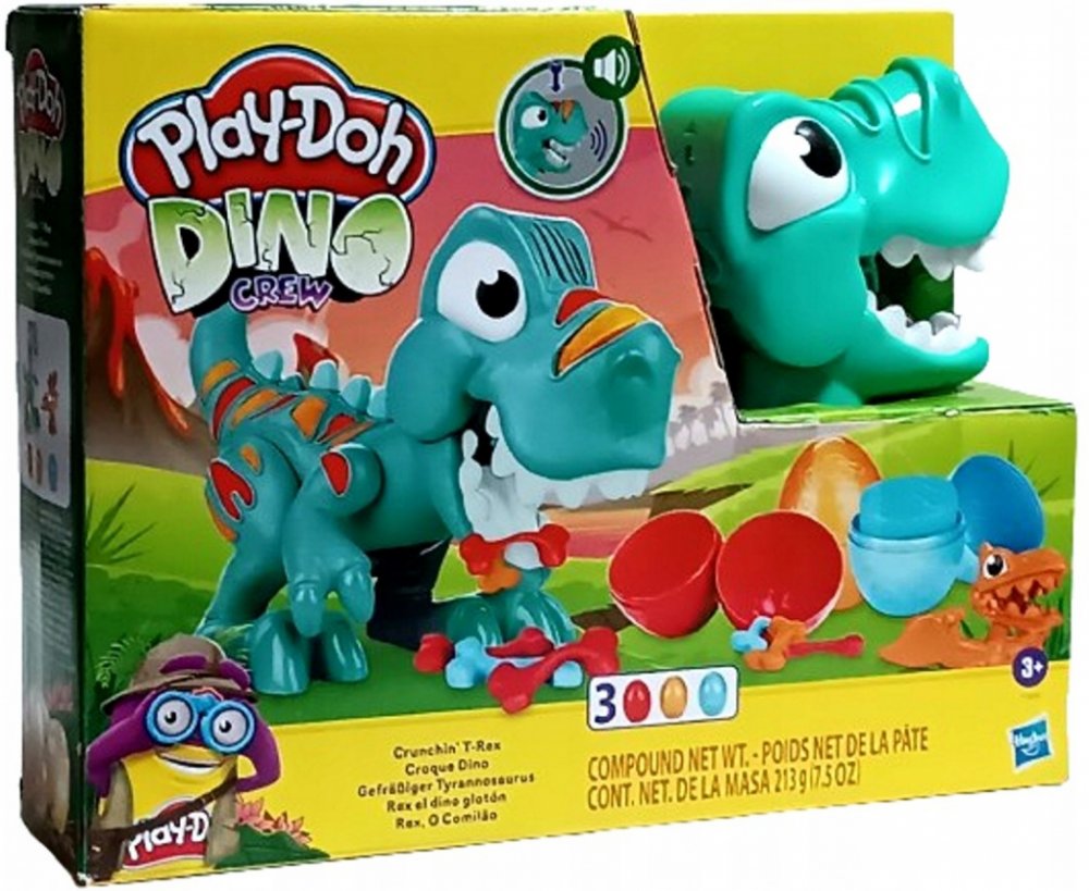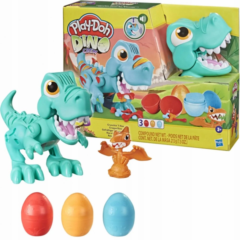 doprovodu legračních zvuků. Z nějakého nepořádku si nedělejte starosti. Tyranosaurův kamarád pterodaktyl sletí na zem, naskládá všechno na hromadu a vytvaruje krásná vajíčka Play-Doh. Modelínu Play-Doh