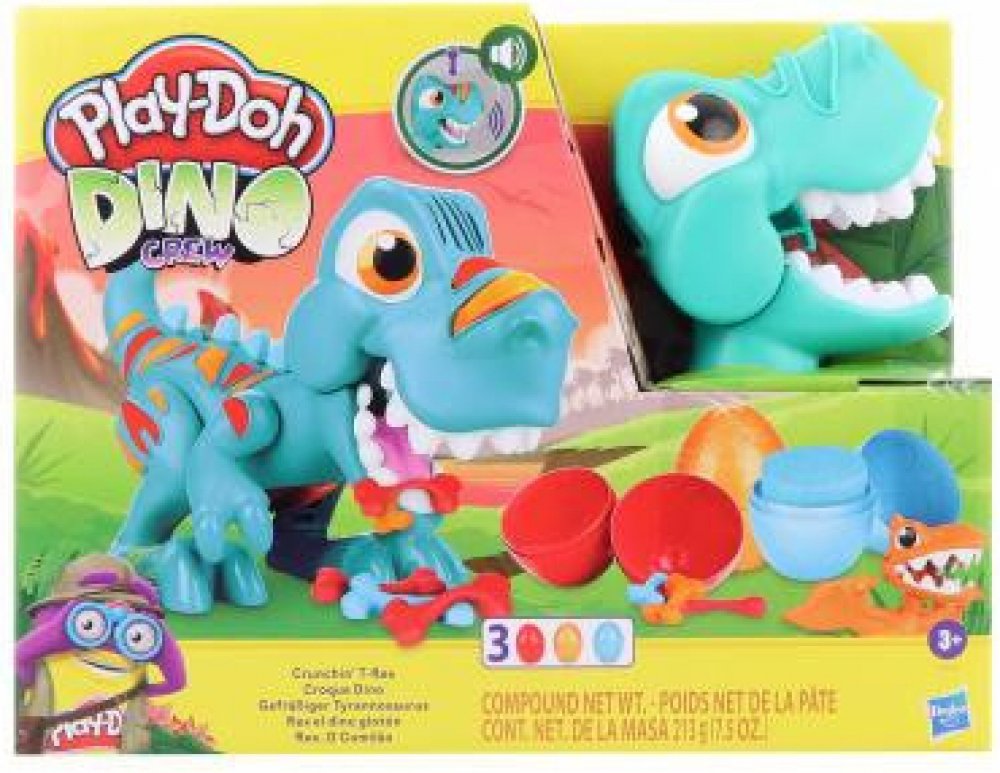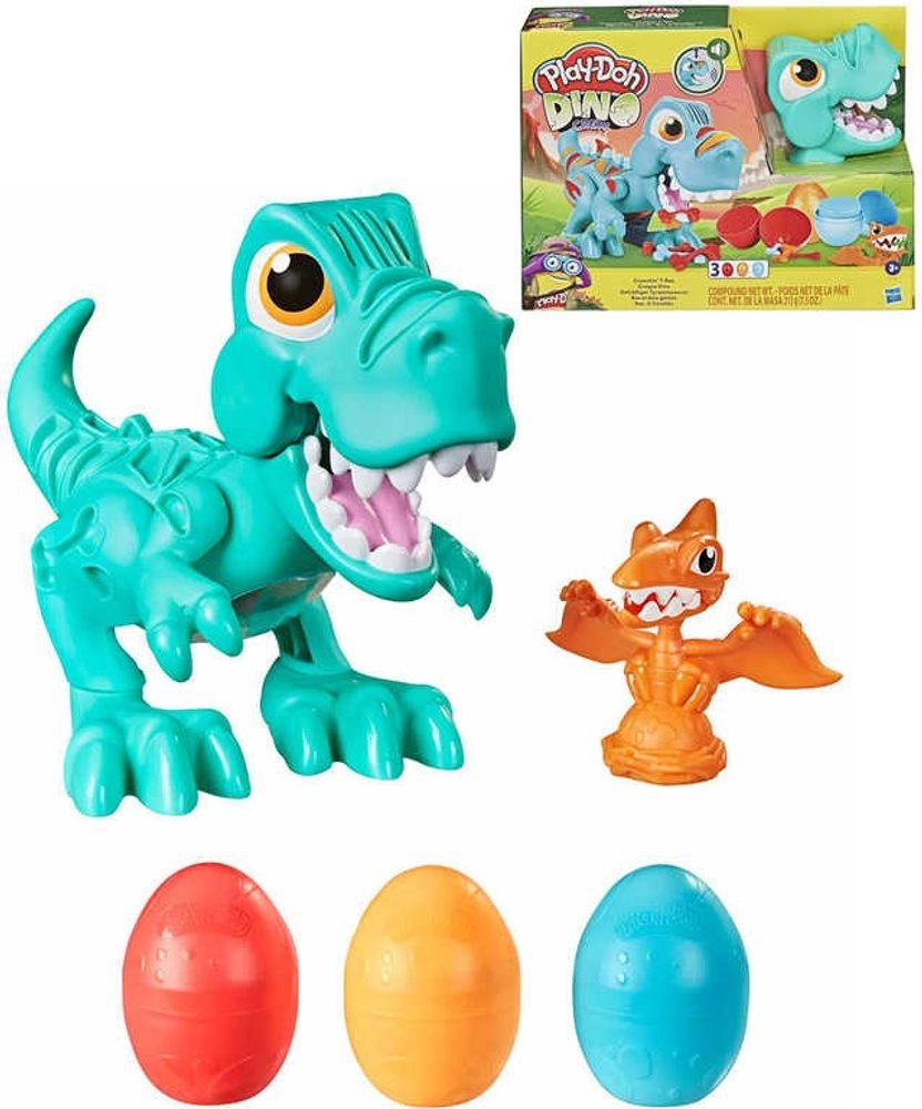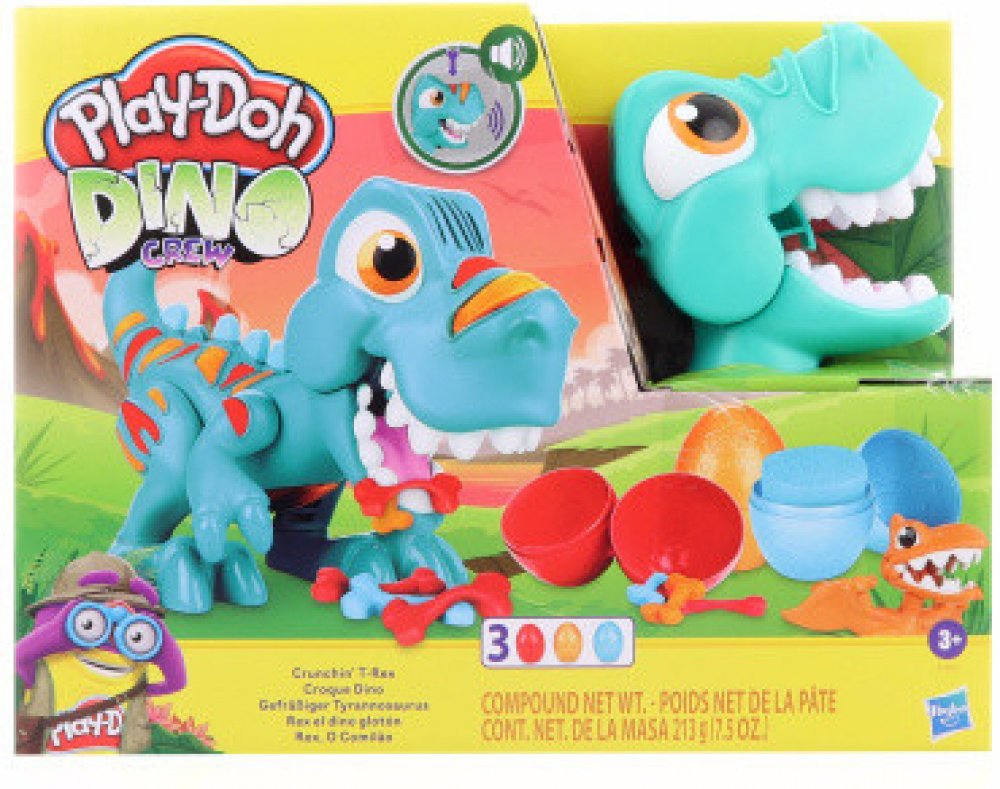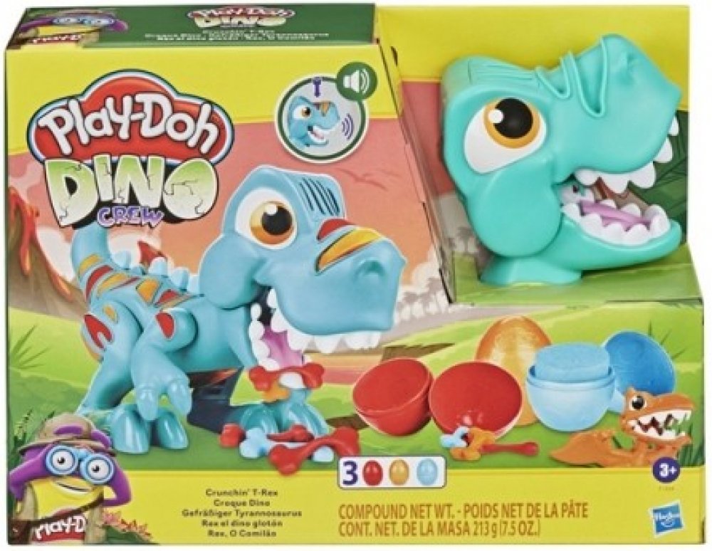 doprovodu legračních zvuků. Z nějakého nepořádku si nedělejte starosti. Tyranosaurův kamarád pterodaktyl sletí na zem, naskládá všechno na hromadu a vytvaruje krásná vajíčka Play-Doh. Modelínu Play-Doh