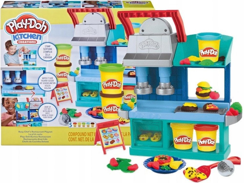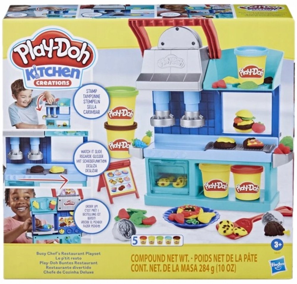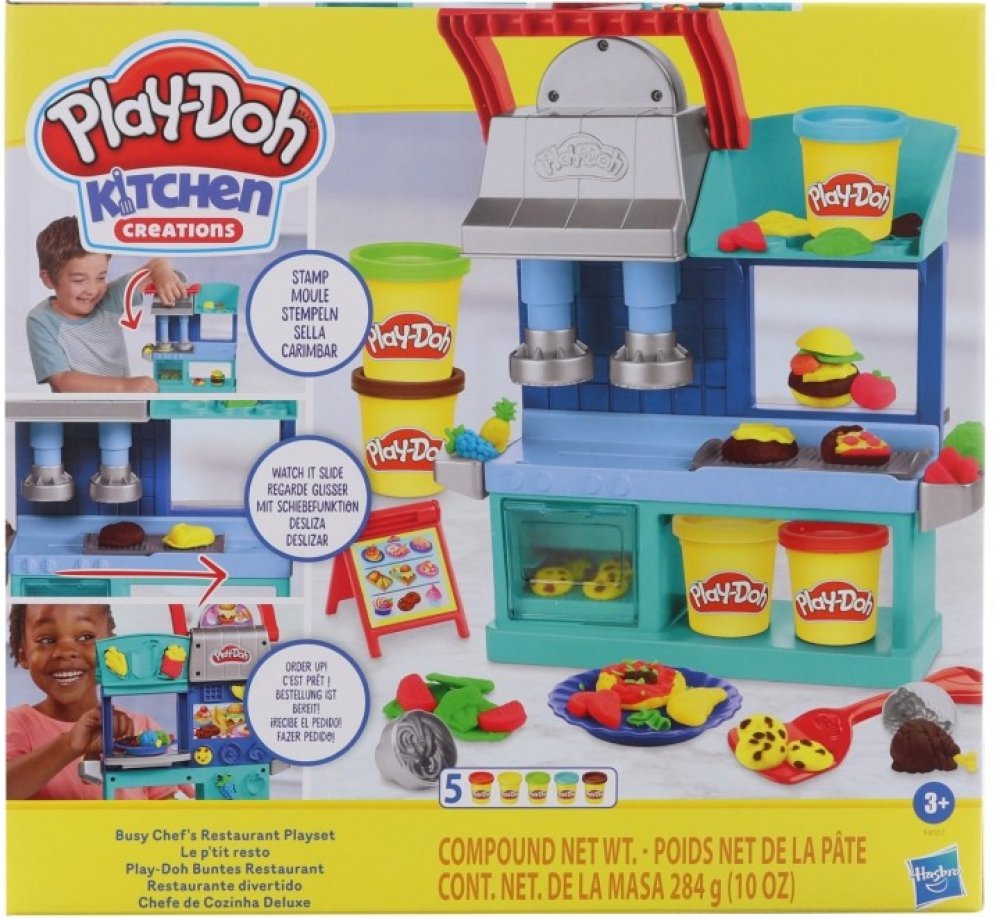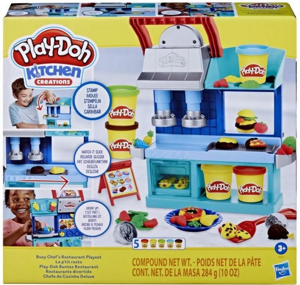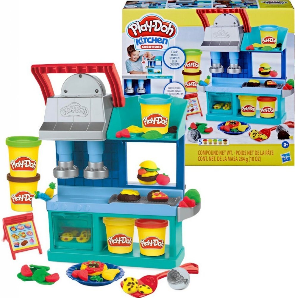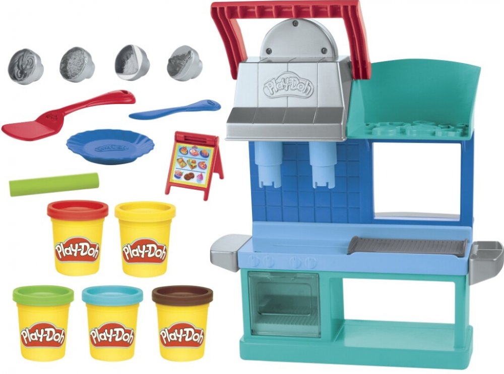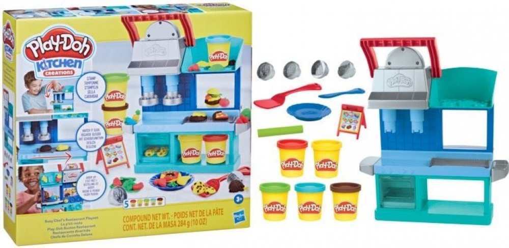 Kreativní sada modelíny Play-Doh a zázemí pro kuchaře, nabízí dětem hru na výrobu rozličných pokrmů.