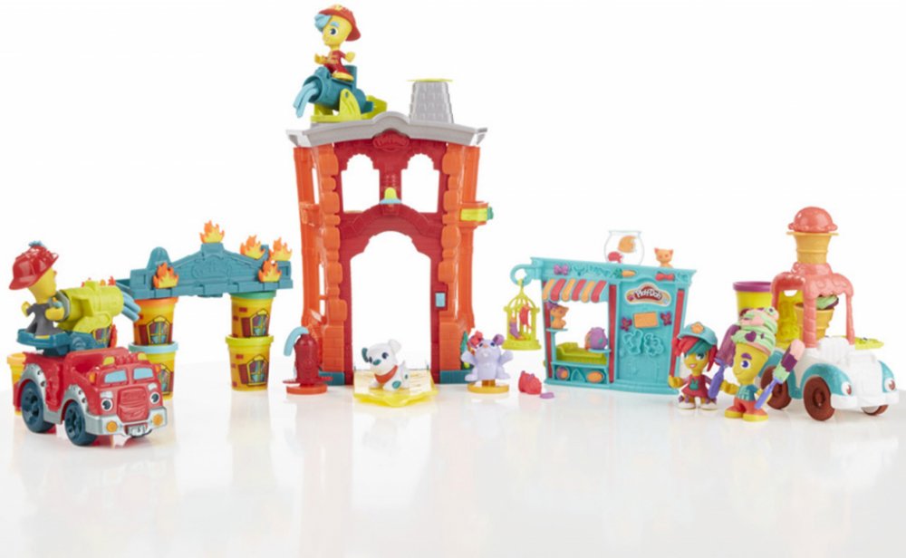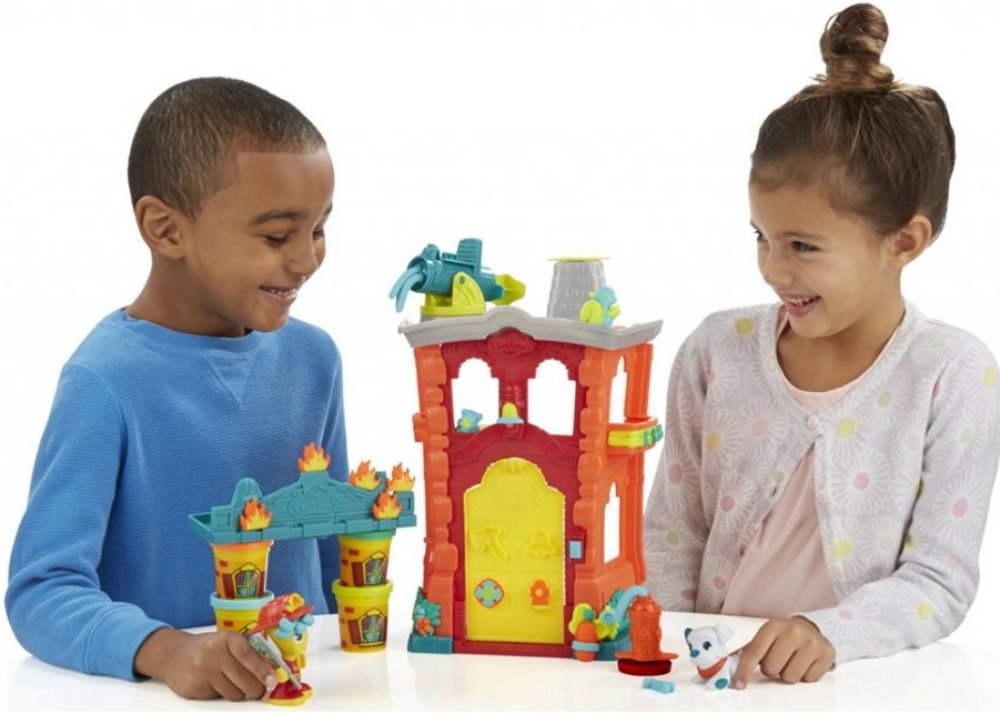V hasičské stanici je pořád čilo. Vystřel spršku vody z modelovací hmoty Play-Doh z hasičské stříkačky na hořící dům, který si sestavíš pomocí kelímků a doplňků. Hasič má sekeru, kterou uchopí do ruky a proseká se do hořícího domu. Při hledání osob v hořícím domě mu pomáhá jeho věrný pes.