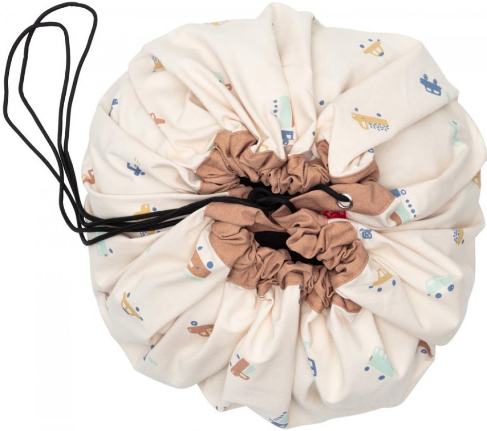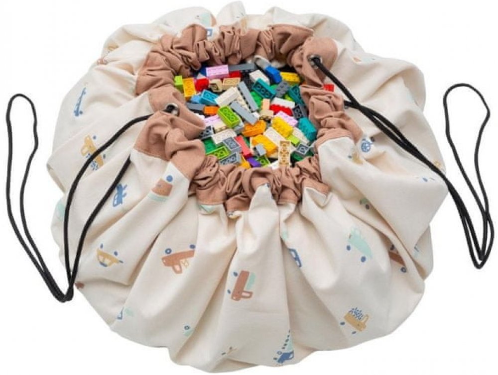 Jakmile si dítě dohraje, stačí zatáhnout za provázek a z hrací deky máme koš na hračky.