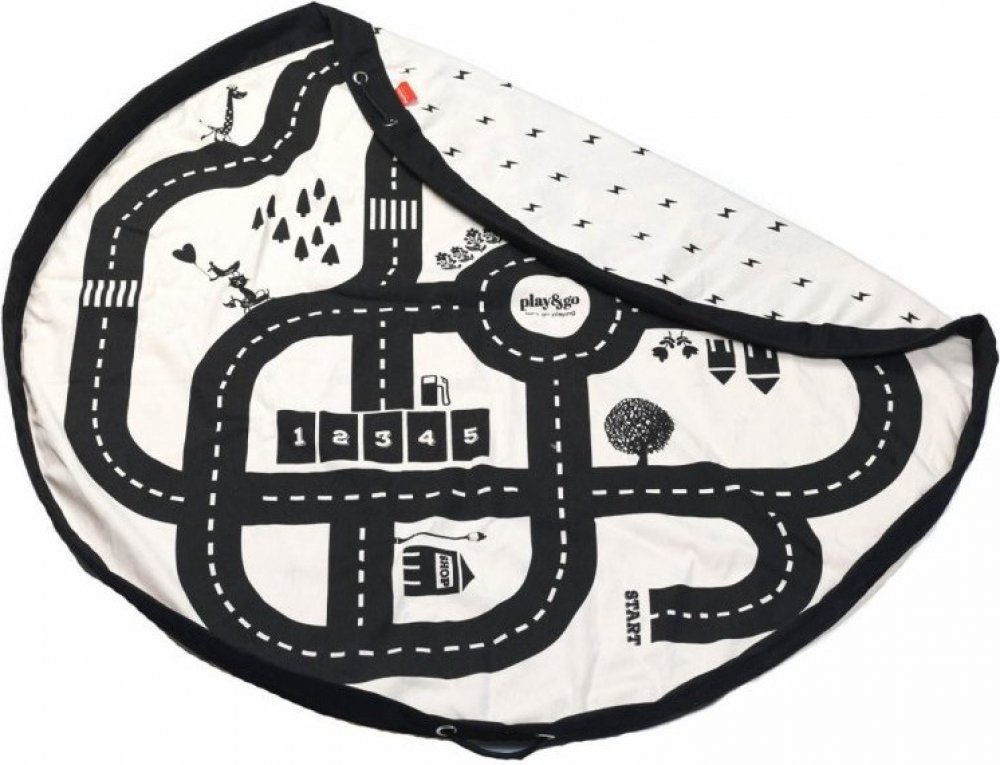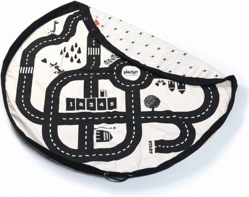 Podložka má oboustranný potisk. Jedna strana vaku je bílá s malými černými blesky a na druhé straně je vyobrazena silnice, budovy, parkoviště a další motivy. Designová hrací podložka podpoří dětskou fantazii a vezme děti do světa her. Zároveň si budou hrát pěkně v teploučku a nebude jim chladno od podlahy.