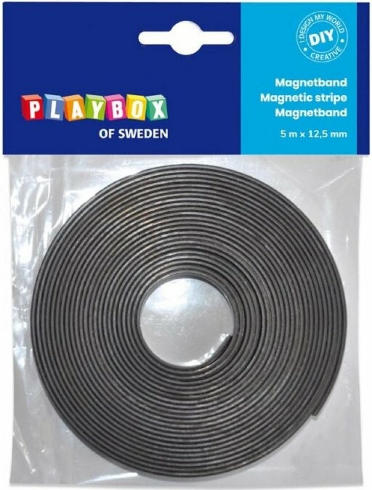 Magnetická samolepicí páska PLAYBOX 12,5 mm × 5 m je praktický pomocník pro kreativní i domácí projekty. Vyrobená ve Švédsku z kvalitního materiálu, kombinuje silný magnetický účinek a samolepicí zadní stranu. Stačí odlepit ochrannou fólii a nalepit na požadovaný povrch. Páska se snadno stříhá nůžkami na požadovanou délku, takže přesně přizpůsobíte svému projektu.