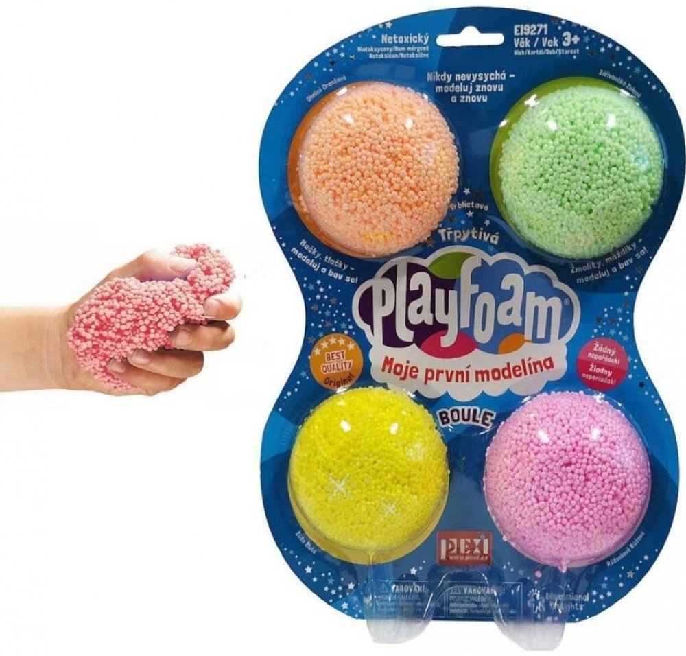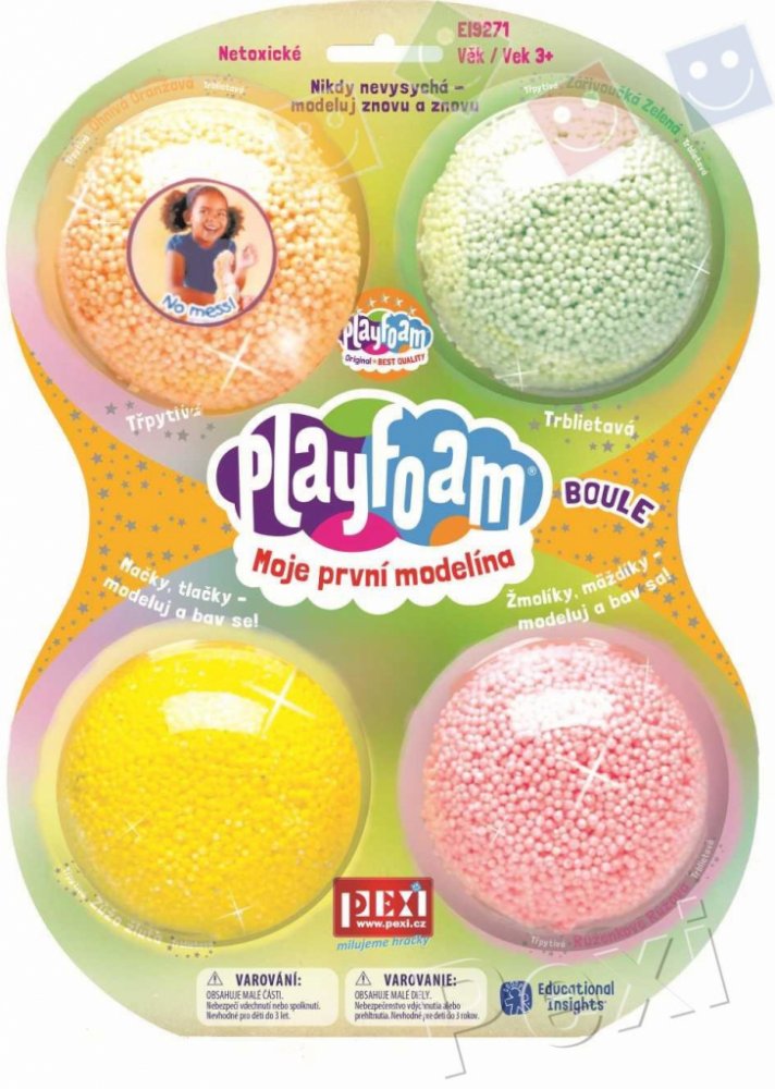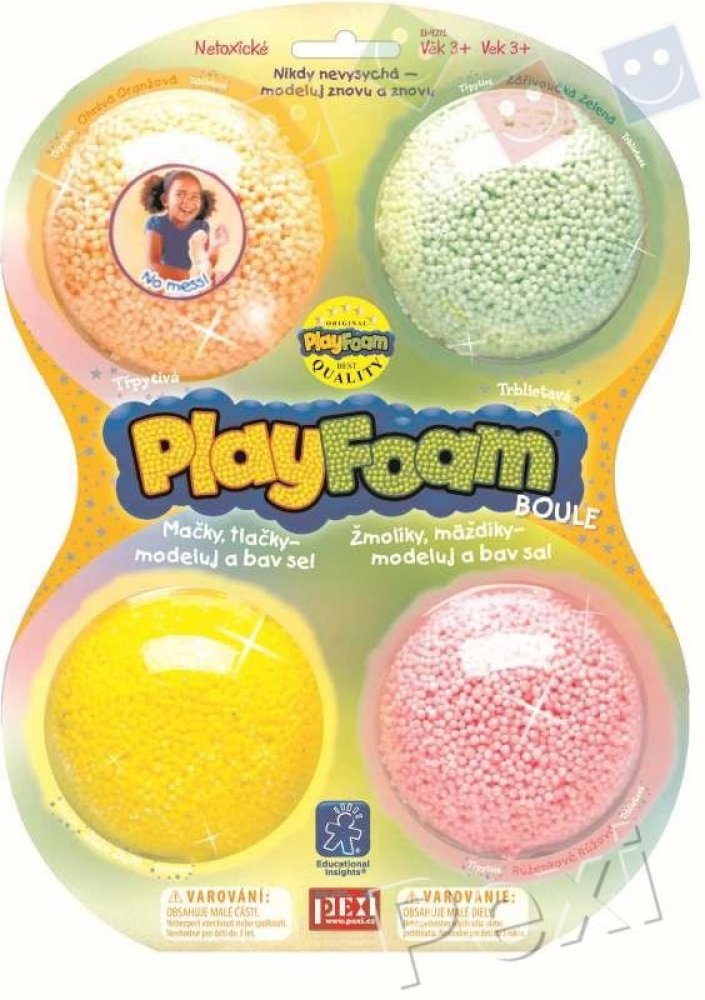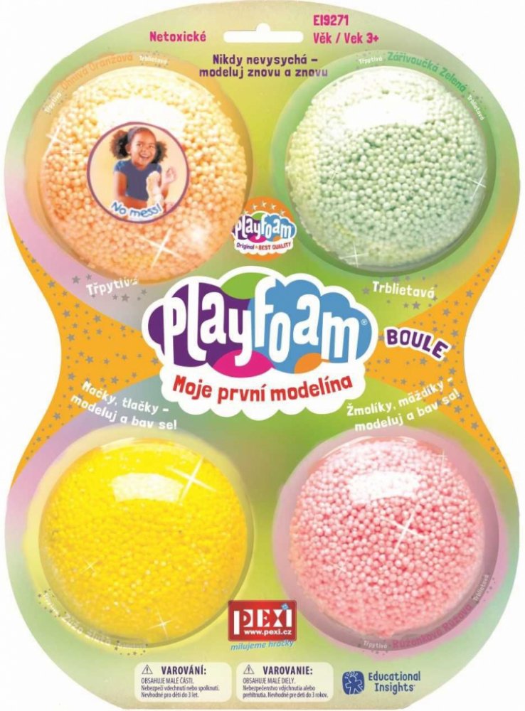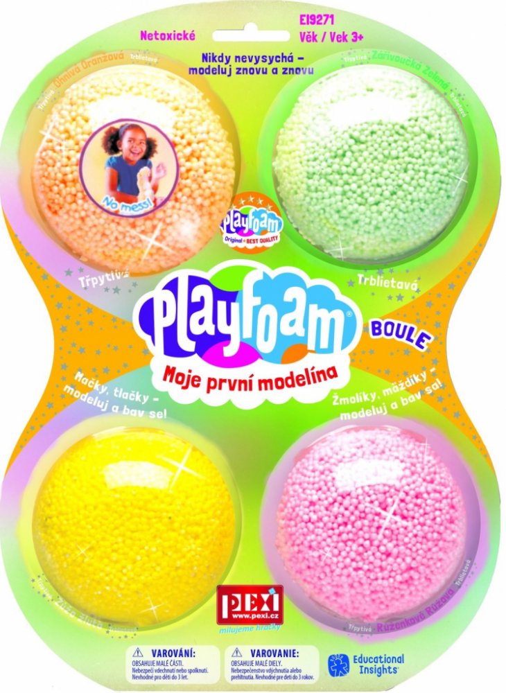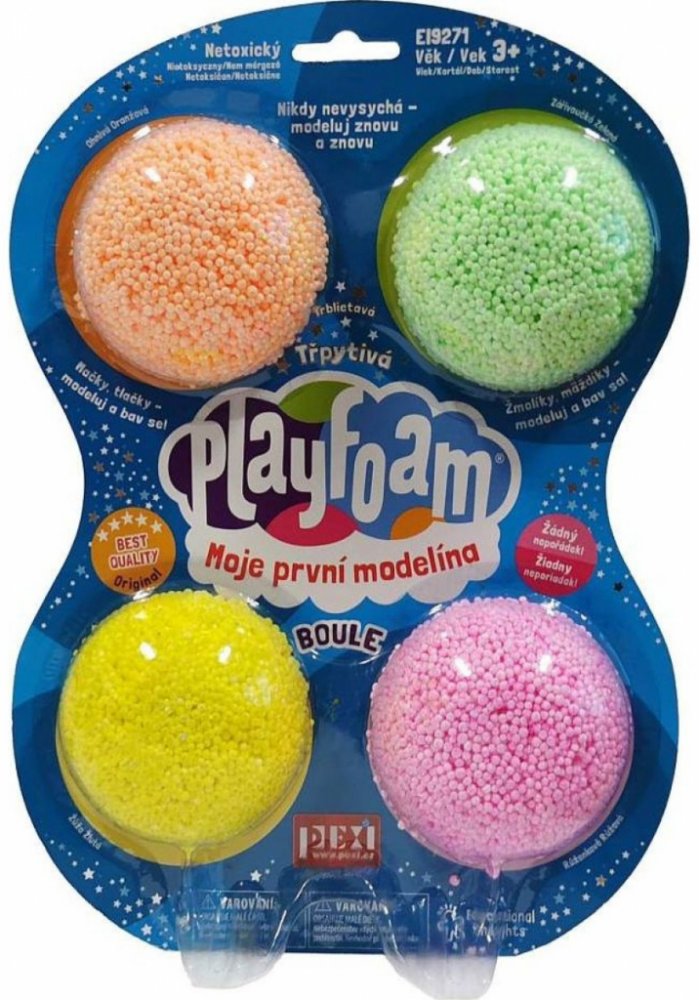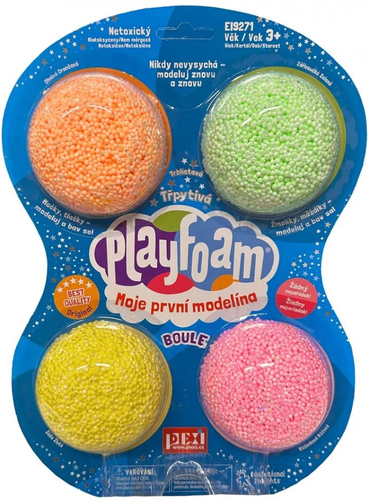 PlayFoam Boule 4pack - 4 barvy s třpytkami, které se blyští na světle.Lehoučká, nešpinivá, netoxická a nevysychající modelína nové generace. Žádný nepořádek, spousty legrace! Vytvoříte vše a uklidíte za okamžik.Technické údaje:Roky 03Obsah balení:PlayFoam Modelína/Plastelína kuličková 4 barvy na kartě 18x27x4cmPokud není uvedeno jinak, cena se vztahuje na 1 ks produktu.Konkrétní barvu nebo druh výrobku není možné z technických důvodů zvolit, objednávce bude přidělena náhodná varianta dle skladových možností.