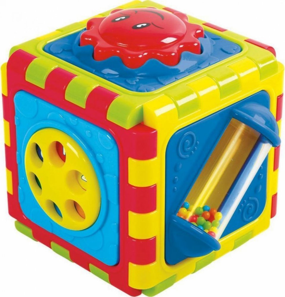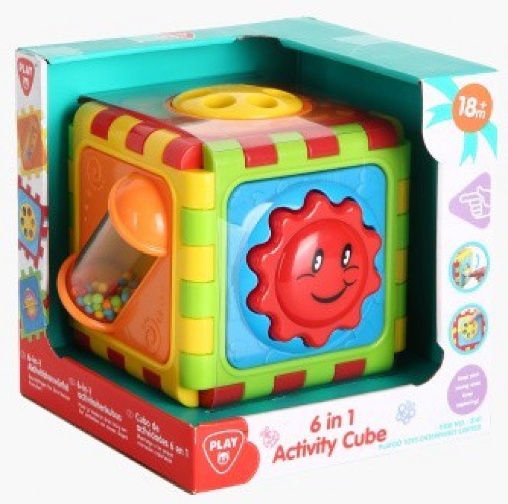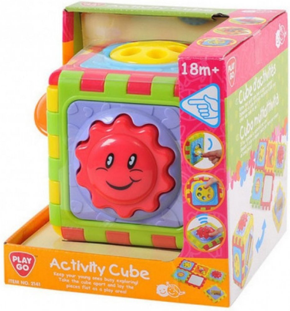 PLAYGO - 6 v 1 kostka s aktivitami. Veselá barevná kostka se spoustou skvělých aktivit pro zlepšování motorických vlastností. Každá strana obsahuje jinou aktivitu, jako například chrastítko, zrcadélko, číslice a různé jiné aktivity. S kostkou si lze hrát v rozloženém i poskládaném stavu. Věk 18m+