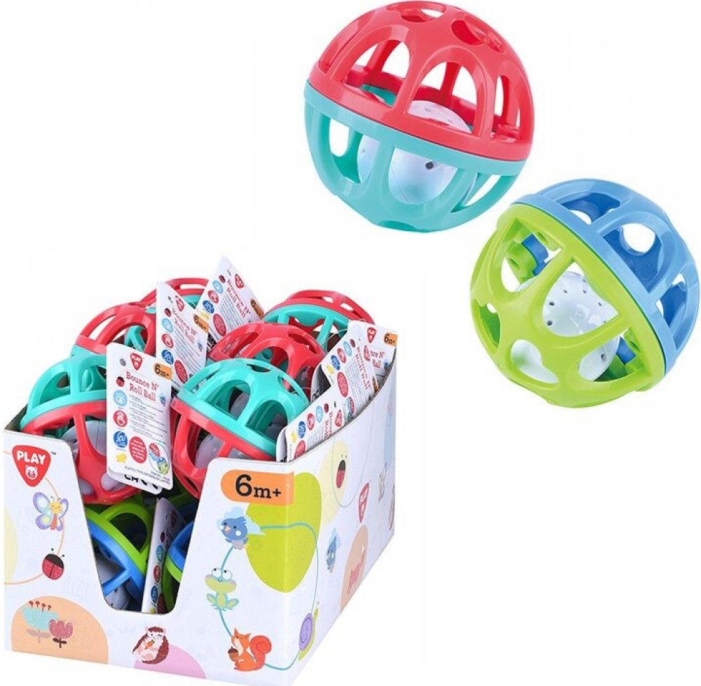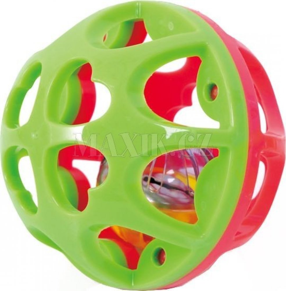 Gumový míček z tvrzeného materiálu s otvory, díky kterým uchopíš i malou rukou. Při hře v míčku poletuje barevná rolnička a krásně zvoní. Rozvíjí jemnou motoriku dítěte, podněcuje dítě k lezení za míčkem.