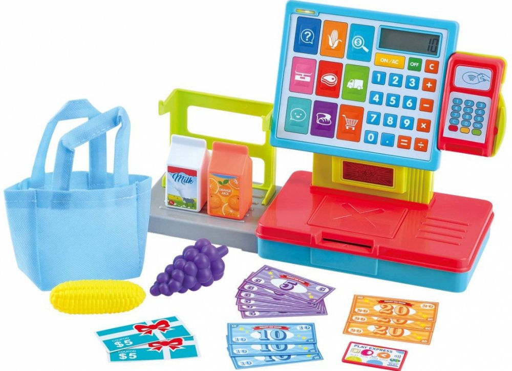 Pokladna. Velikost 32cm. Tlačítka na pokladně vydávají různé zvuky. Některé rozsvěcují zelené světlo. Pokladna funguje jako kalkulačka. Čtečka na pokladně reaguje na pohyb. Po zaznamenání pohybu pípne a na displeji naskočí číslo.