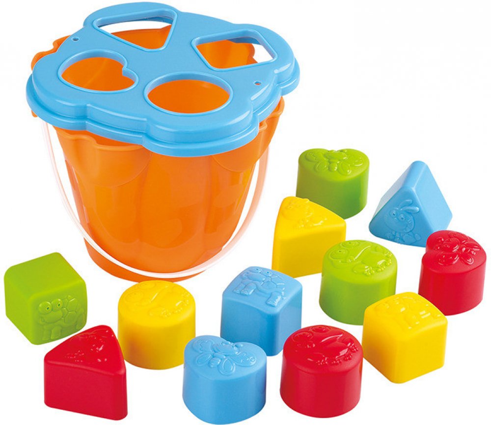 Kbelíček plný kostek různých tvarů (12 ks). Na kbelíčku najdete víčko s otvory, do kterých musí děti zasunout správnou kostku. Vkládačka seznamuje s jednoduchými tvary a základními barvami, stejně tak rozvíjí jemné motorické dovednosti.