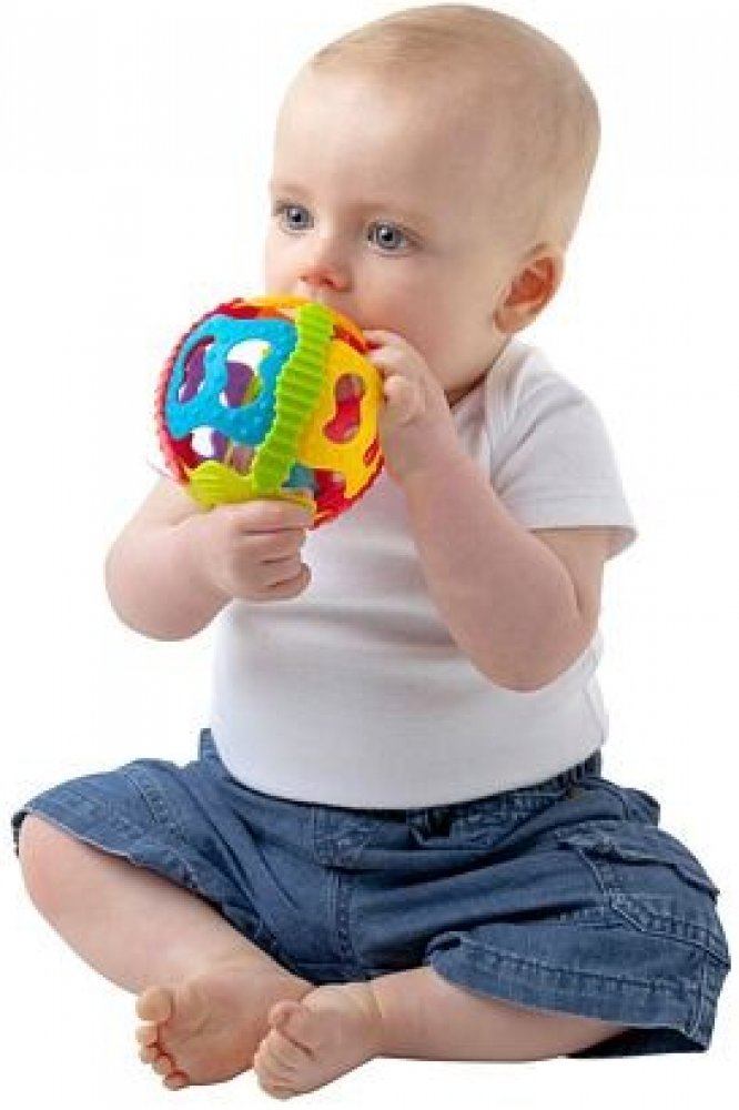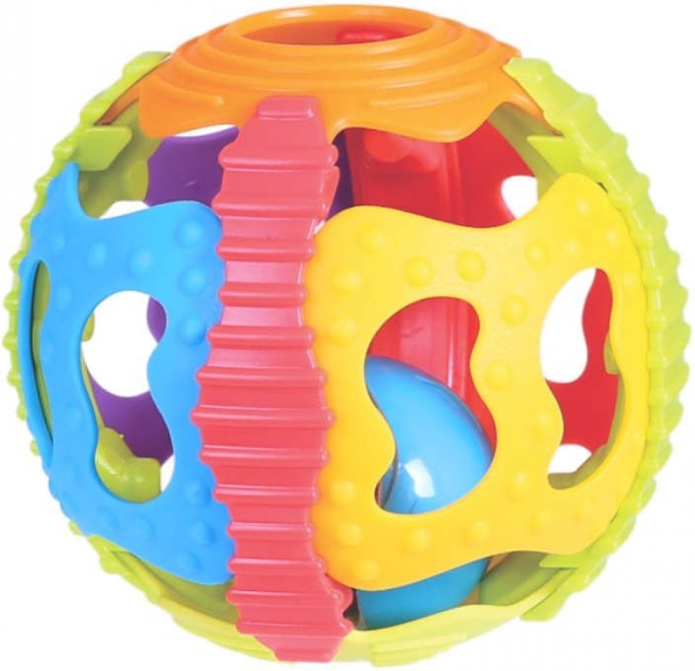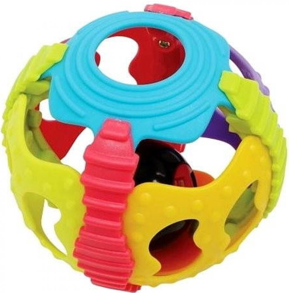 Míček není celistvý, takže ho dítě může vzít snadno do ruky a nebo i kousat. Uvnitř ukrytá kulička vydává rachtavé zvuky. Hračka podporuje dětskou motoriku, pohybové schopnosti, zrak i sluch. Pokud se míček od dítěte odkutálí, bude se snažit k němu pohybem dostat.