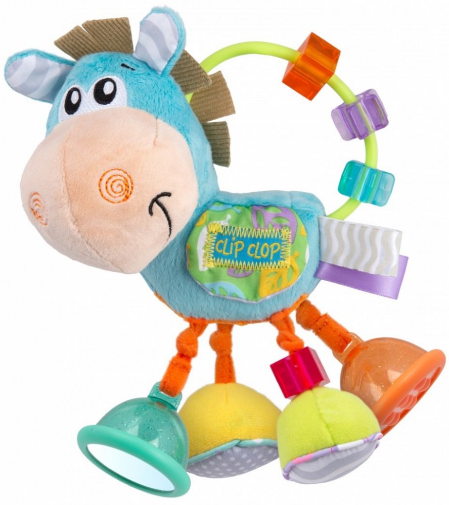 Veselý oslík je vyrobený z jemné plyše a hýří všemi barvami a je multifunkční. Díky barvám rozvíjí u dětí zrak. Kopýtka jsou každé jiné a každé vydává rozmanitý zvuk, který závisí na akci dítěte. Ve dvou kopýtkách jsou barevné kuličky, které chrastí, když si s kopýtky dítě hraje. Tyto všechny vlastnosti rozvíjí u dítěte sluch. Na dolní straně jednoho kopýtka je umístěná odrazka, fungující jako zrc...
