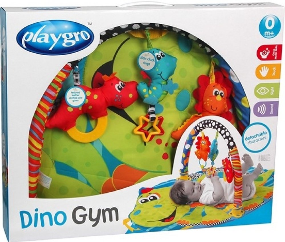 Na hrazdičce jsou upevněni tři kamarádi našeho dinosaura, které se při každém pohybu rozkývají. Dětátko má snahu se jich dotýkat a tím dochází k rozvoji jemné motoriky. Součástí vysacích hraček je kousátko, které v pozdějších měsích ulevuje při prořezávání zoubků. Ukryté chrastítko zase pomáhá rozvíjet sluch.