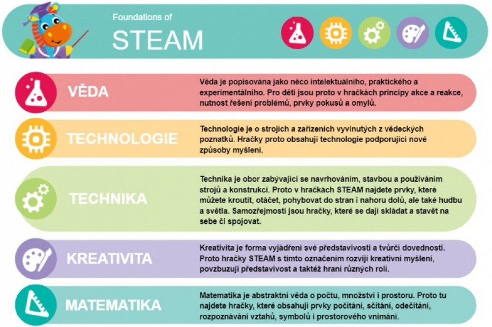 Výhodou je, že hračky s označením STEAM pomáhají rozvíjet dovednosti, řešení problémů, vytrvalost, komunikaci i mentální obratnost u dětí již od narození