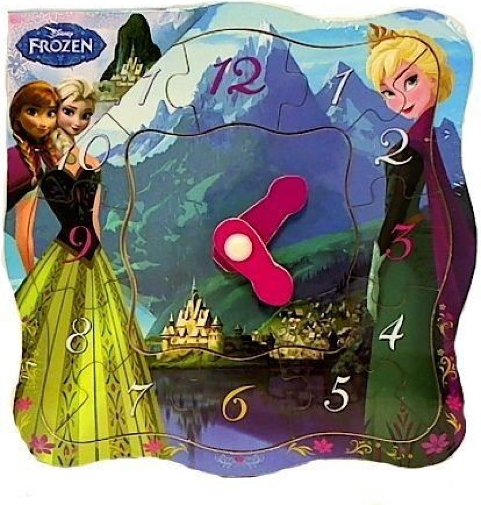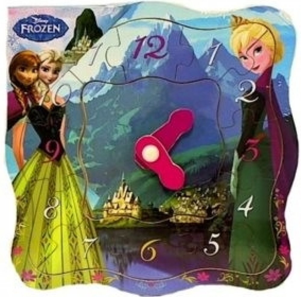 Dřevěné hodiny s Annou a Elsou z pohádky Ledové království. Puzzle má otočné ručičky a vkládací čísla od 1 do 12. Dítě se zábavnou formou seznamuje s poznáváním hodin, učí se nejprve rozeznat a správně umístit čísla, později lze vkládací puzzle díky pohyblivým hodinovým ručičkám využít na poznávání hodin. Doporučeno pro děti od 12 měsíců.