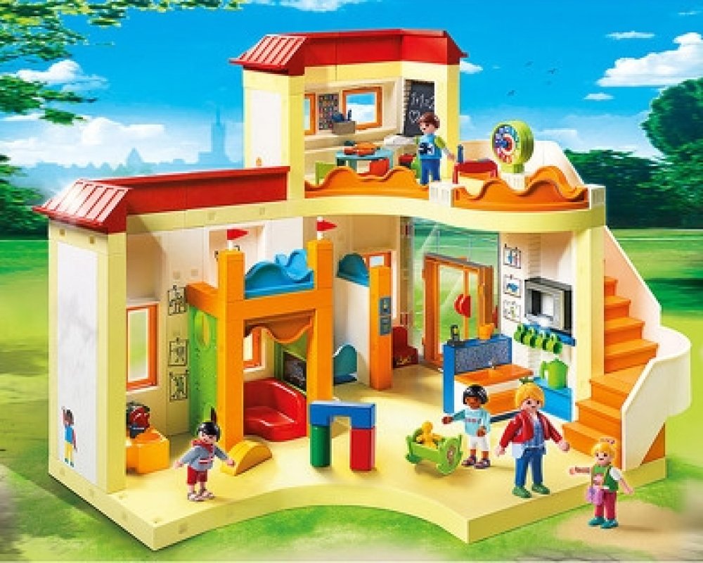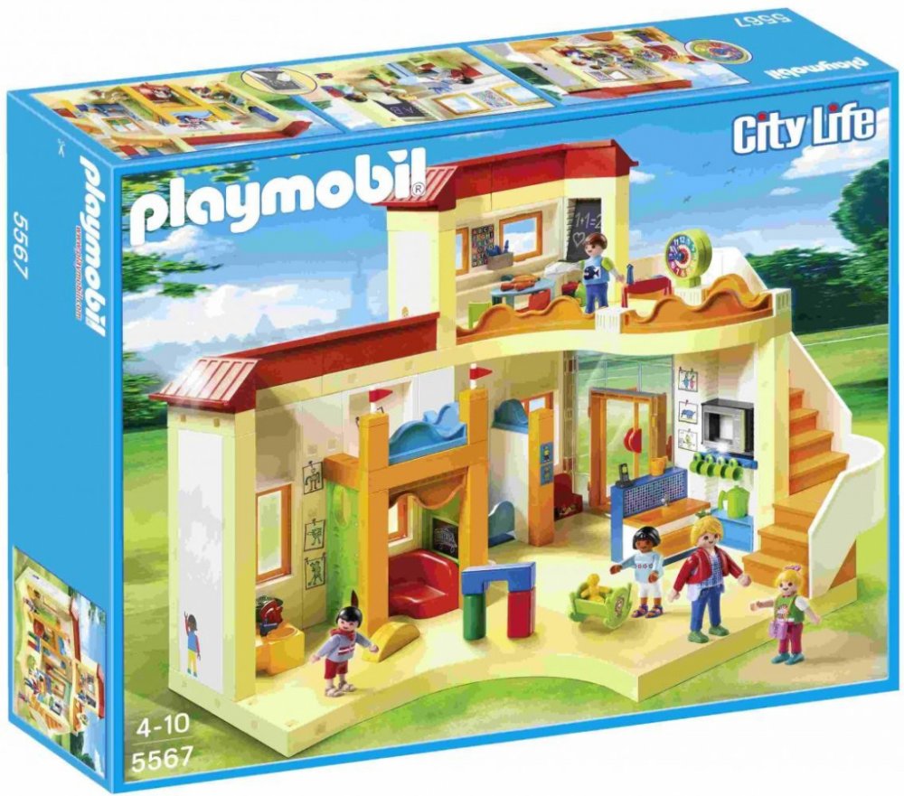 Školka s plně vybavenou kuchyňkou a toaletami. Ve školce se můžeš seznámit s novými kamarády. Je zde spoustu hraček a můžeš si hrát, kreslit, zpívat a učit se. Dej si malou svačinku a naber další síly na hraní s kamarády. Ve školce je funkční tabule a nastavitelné hodiny.