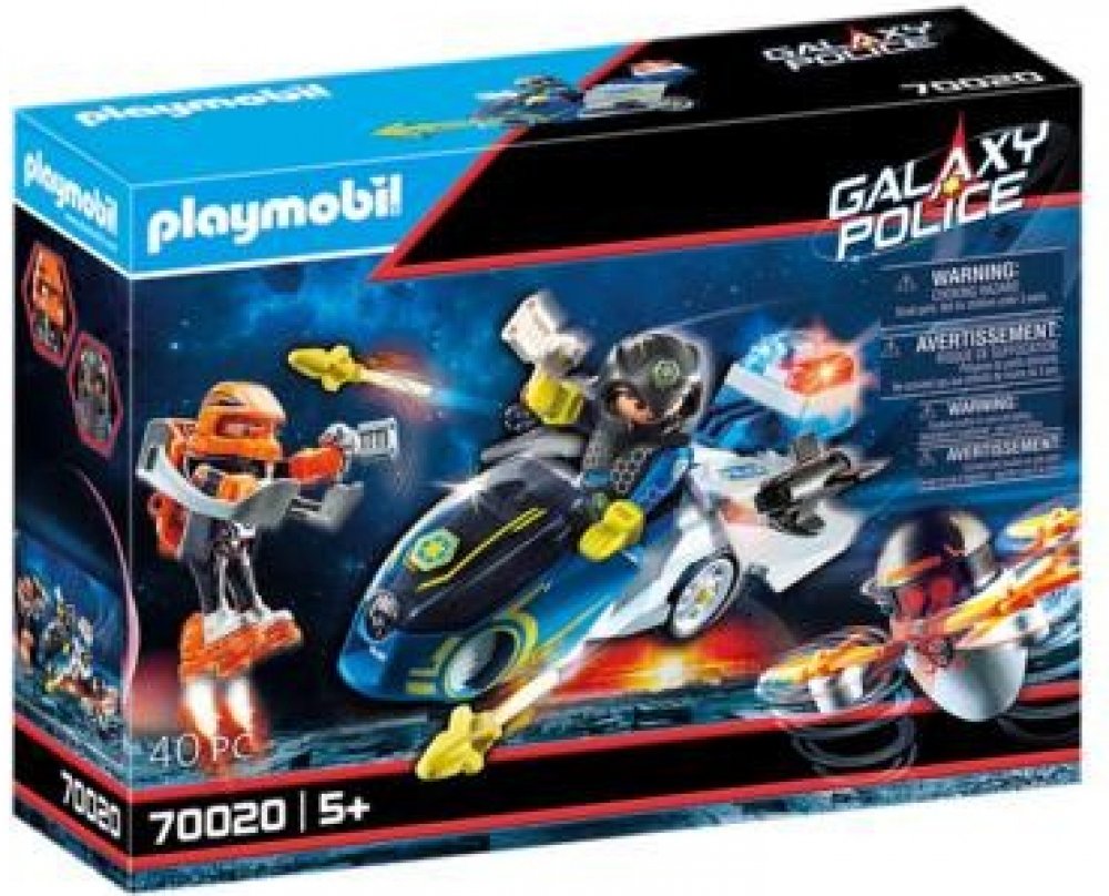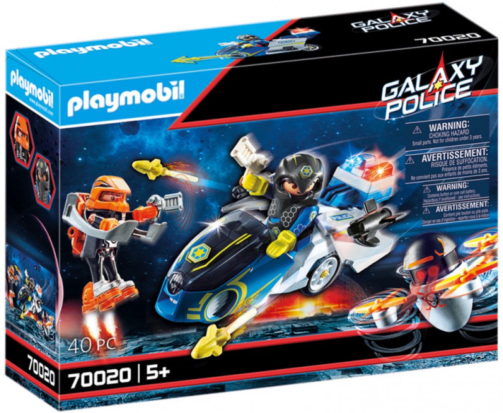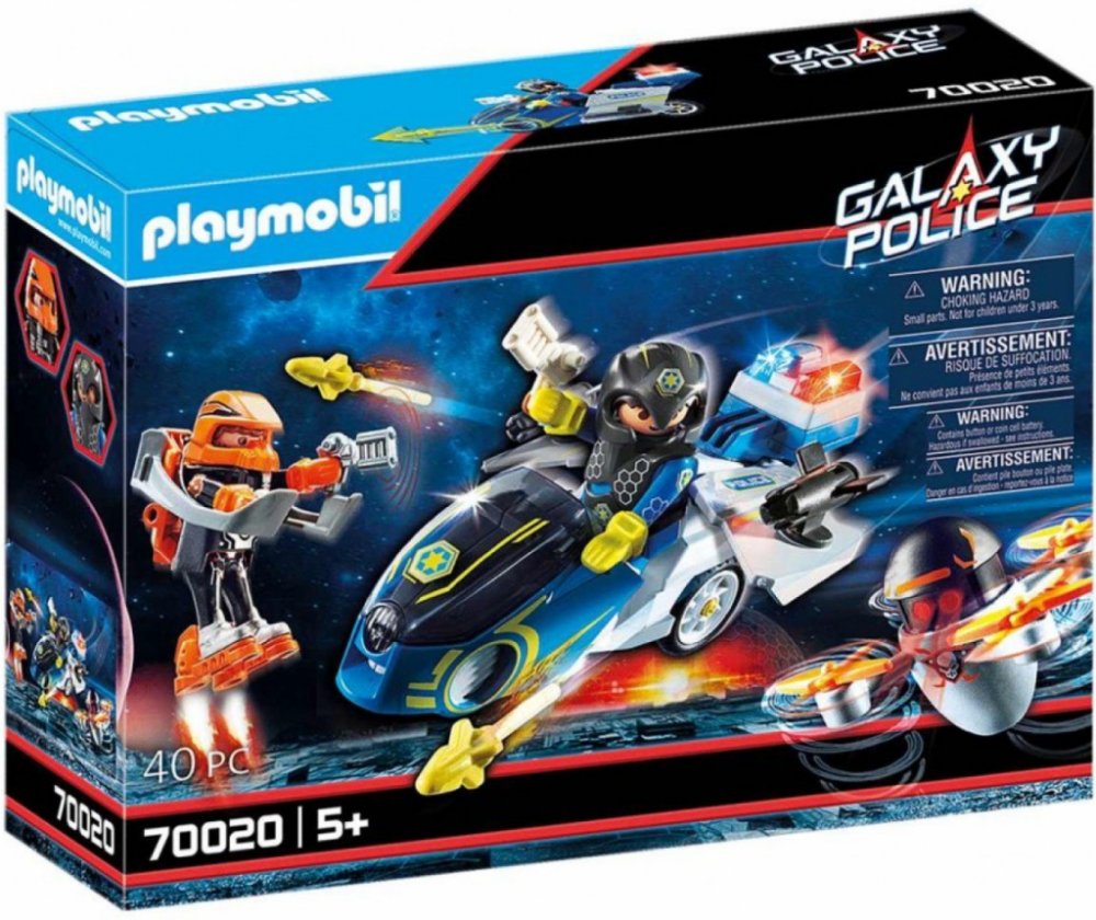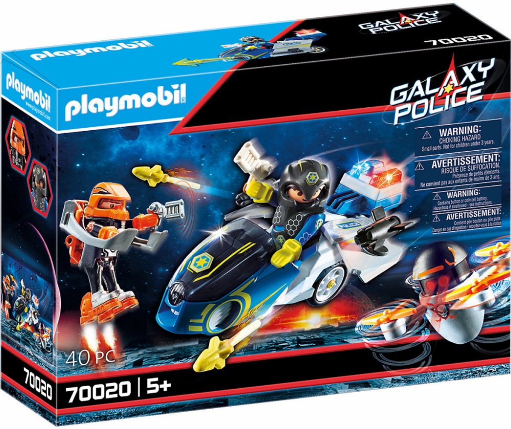 Na zemi nebo ve vzduchu, nikdo není rychlejší než vesmírný policista se speciální motorkou. Vesmírný pirát se snaží uniknout pomocí tryskových bot, ale policejní motorka má vyklápěcí křídla a zločinec nemá šanci uniknout.motorka s vyklápěcími křídly a funkčními střelamifunkční blikající světlo motorky (baterie jsou součástí setusoučástí setu je kosmický pirát s tryskovým batohem a dronem pro napín...