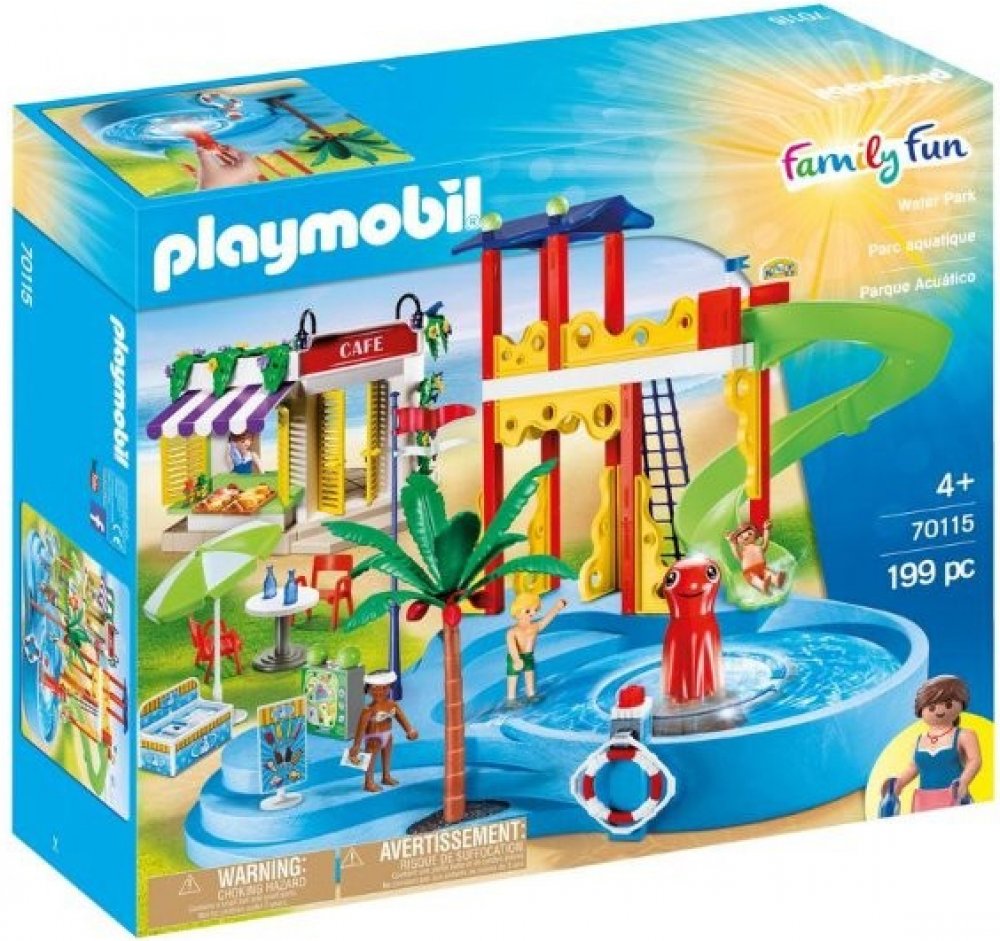 Balení obsahuje: 3 figurky (7,5 cm), 1 figurku (5,25 cm), bazén s tobogánem, stánek s občerstvením, palmu, slunečník, stůl, 2 židle, mrazák na zmzlinu, reklamní poutač, záchranný kruh a další doplňky.