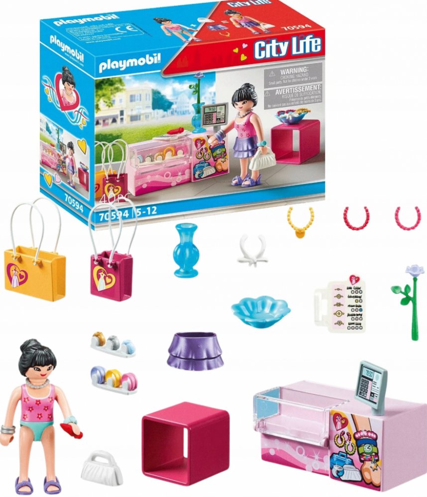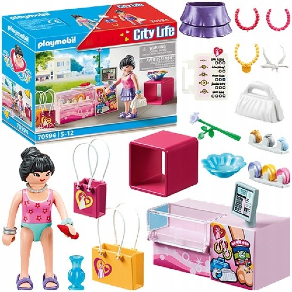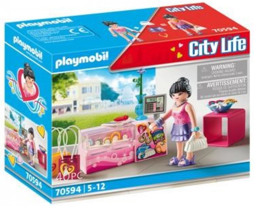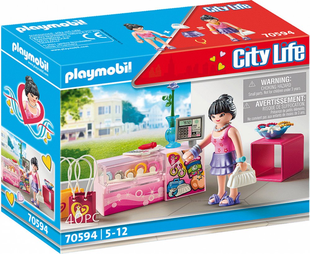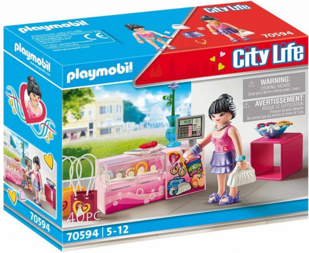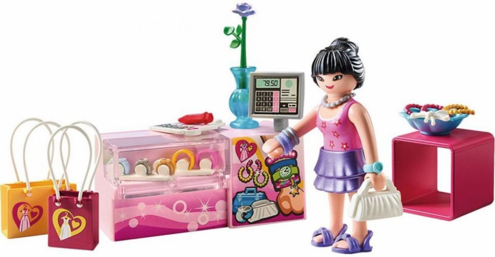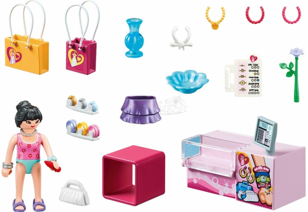 Herní sada obsahuje figurku PLAYMOBIL, prodejní stojan na doplňky s hodinkami, šperky, cenovky a další skvělé doplňky.