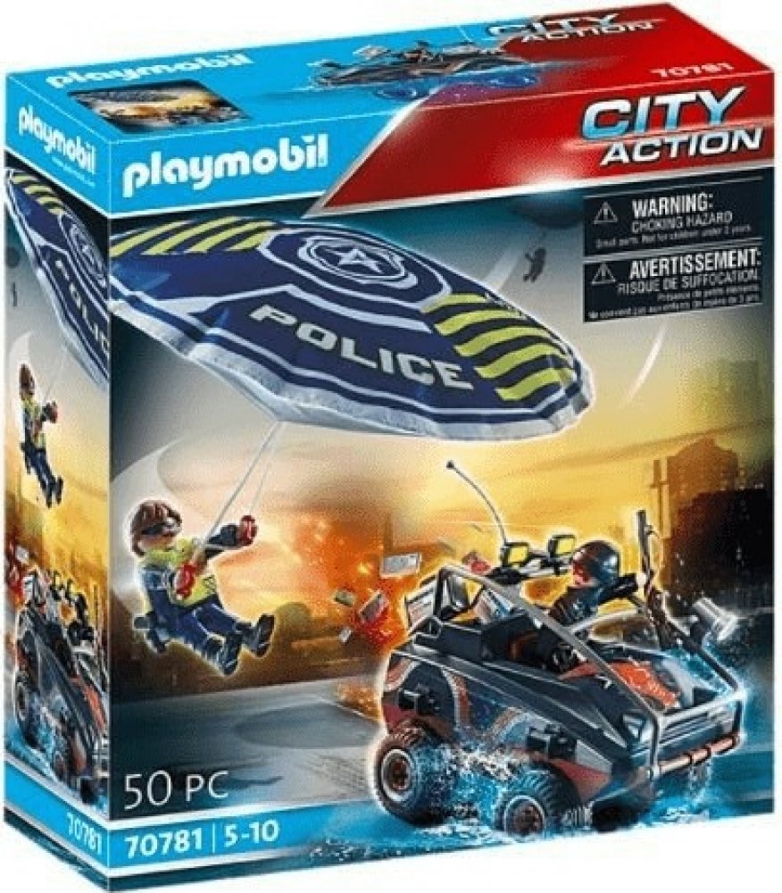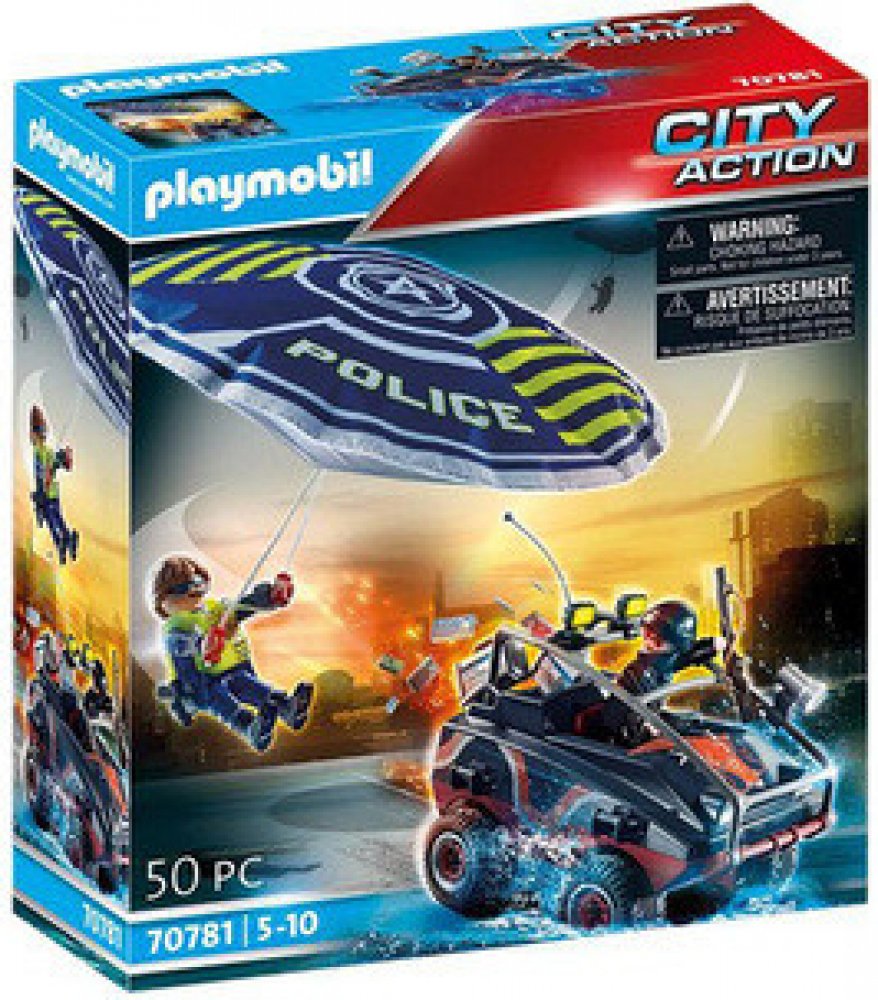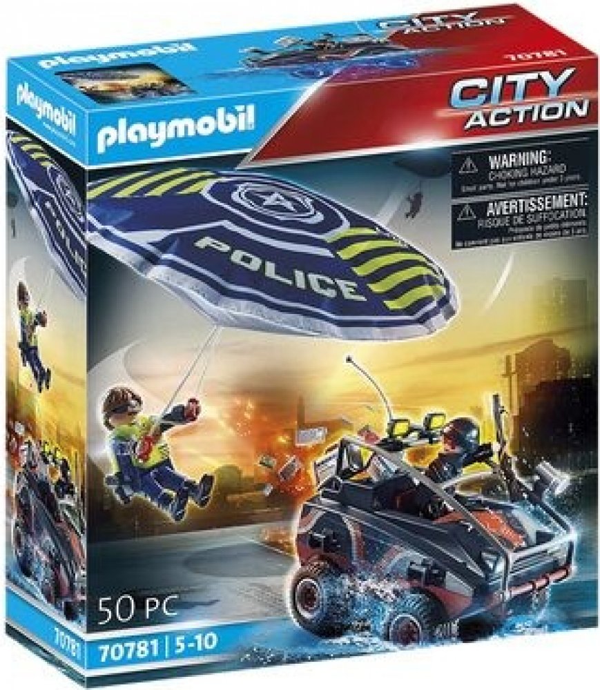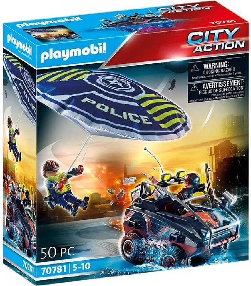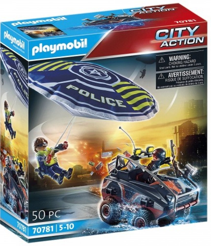Policejní padák pronásleduje bankovního lupiče, který utíká do moře ve svém obojživelném vozidle. Zloděj je na útěku ve svém obojživelném vozidle. Bezpečně uložil peníze za sedadlo řidiče. Aby se skryl, zajíždí co nejdál to jde. Policie PLAYMOBIL má ale řešení i pro tento případ. Lokalizují vozidlo ze vzduchu a parašutista padá přímo na místo. To zloděj nečekal a nemůže včas utéct. Tato jízda konč...