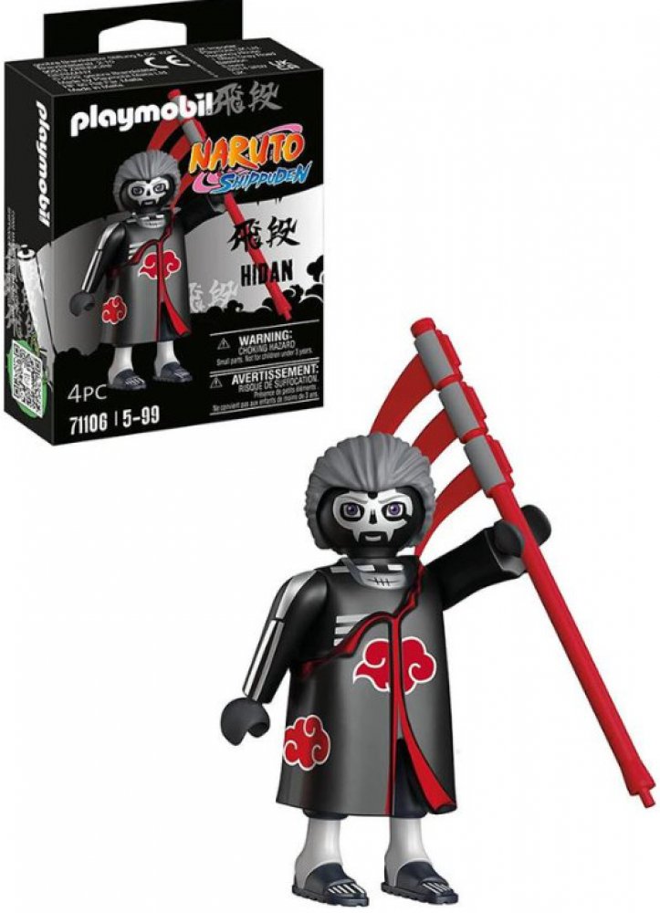 HidanNosí černý plášť Akatsuki a v ruce třímá obrovskou tříbřitou kosu, kterou děsí své protivníky.Hidan je členem Akatsuki a fanatickým stoupencem Jašinismu. Díky svému náboženství je nesmrtelný a může své protivníky proklínat rituálem. Při provádění rituálu jeho kůže zčerná a objeví se na ní bílé čáry připomínající kostru. Hidan si ničeho a nikoho neváží. Sada Playmobil představuje Hidana v čern...