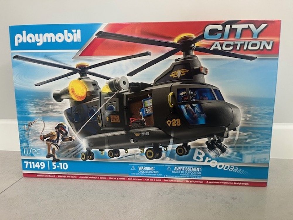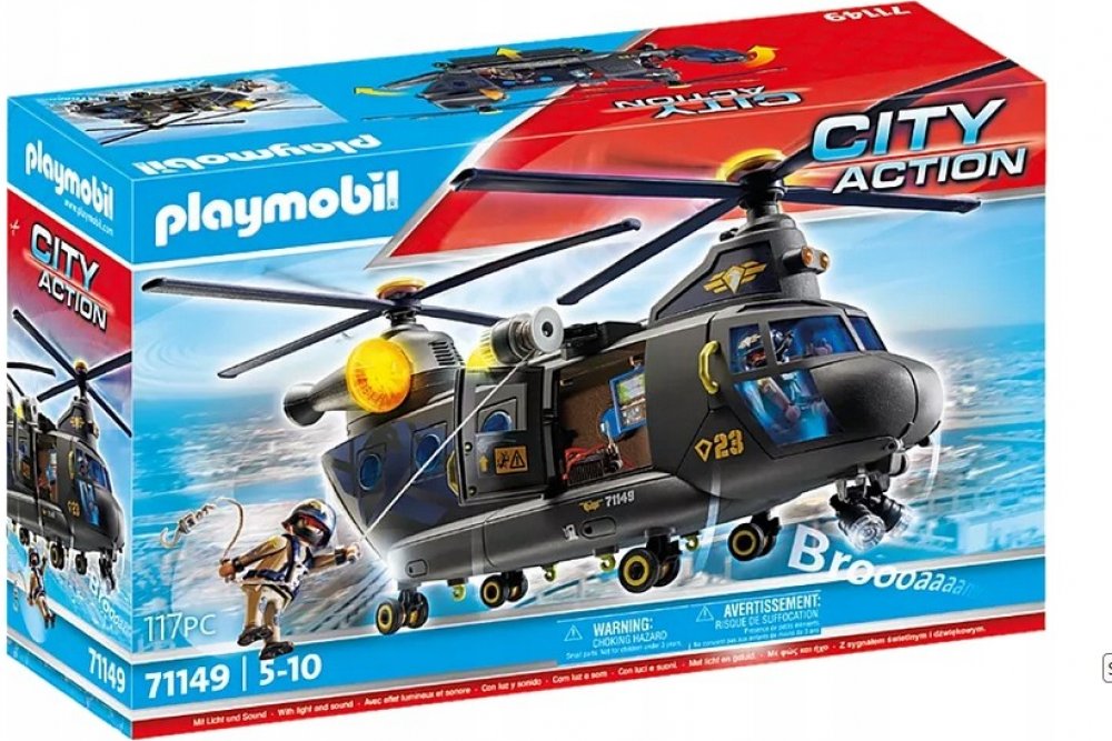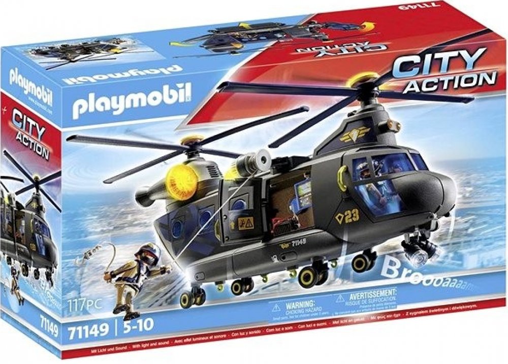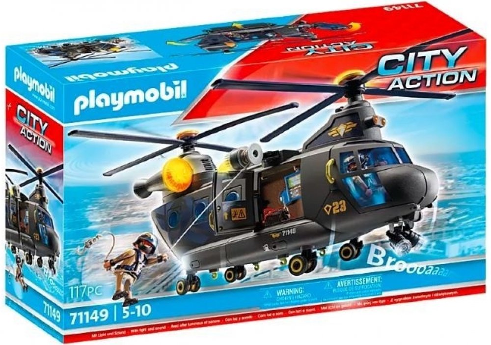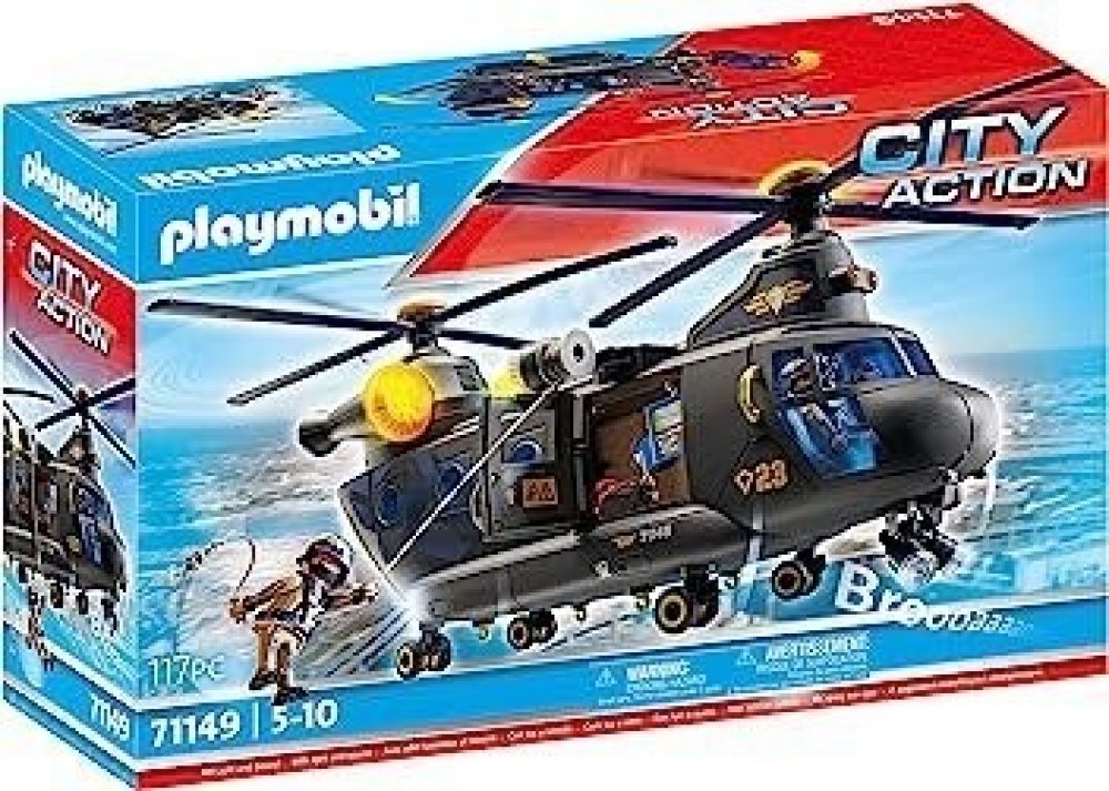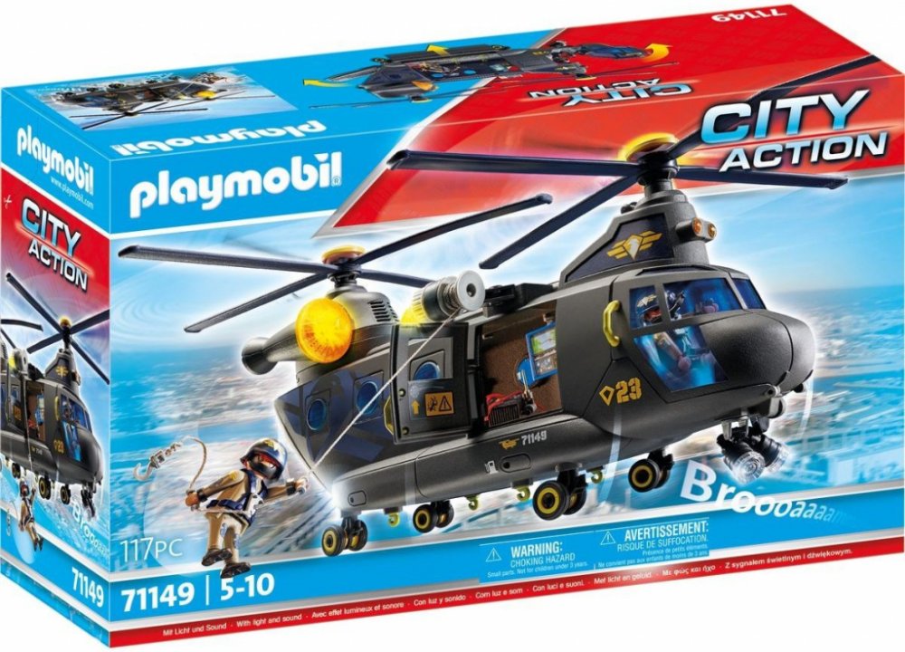 Se záchranářským vrtulníkem s navijákem od PLAYMOBIL nejsou pro speciální jednotku výzvou ani operace ve vzduchu. V kokpitu je místo pro dvě figurky a v podpalubí jsou dvě výklopná sedadla pro více postav. Integrovaný světelný a zvukový modul je ovládán pohybem rotoru. Citlivý náklad lze zajistit pomocí ráčnového popruhu a v případě potřeby přepravy dalšího nákladu se další náklad připevní k podlaze vrtulníku pomocí transportních řetězů.