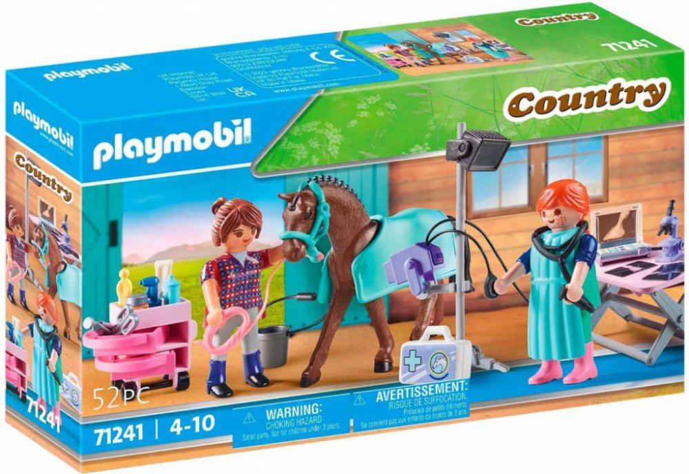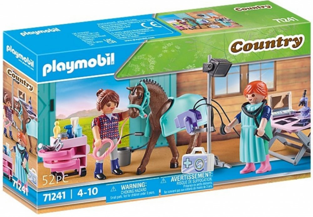 Pomocí mobilního rentgenového přístroje lékař pořídí snímky zraněné koňské nohy. Poté si snímky důkladně prohlédne na notebooku. Sada obsahuje obvazové štítky pro ošetření zvířete. Další veterinární vybavení je uloženo v praktické boční skříňce s kolečky. S láskou navržená herní sada, ideální pro děti, které by samy chtěly být veterinářem.