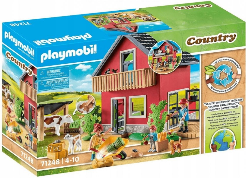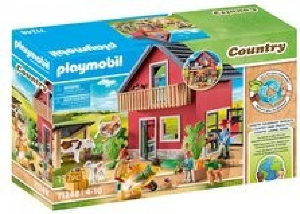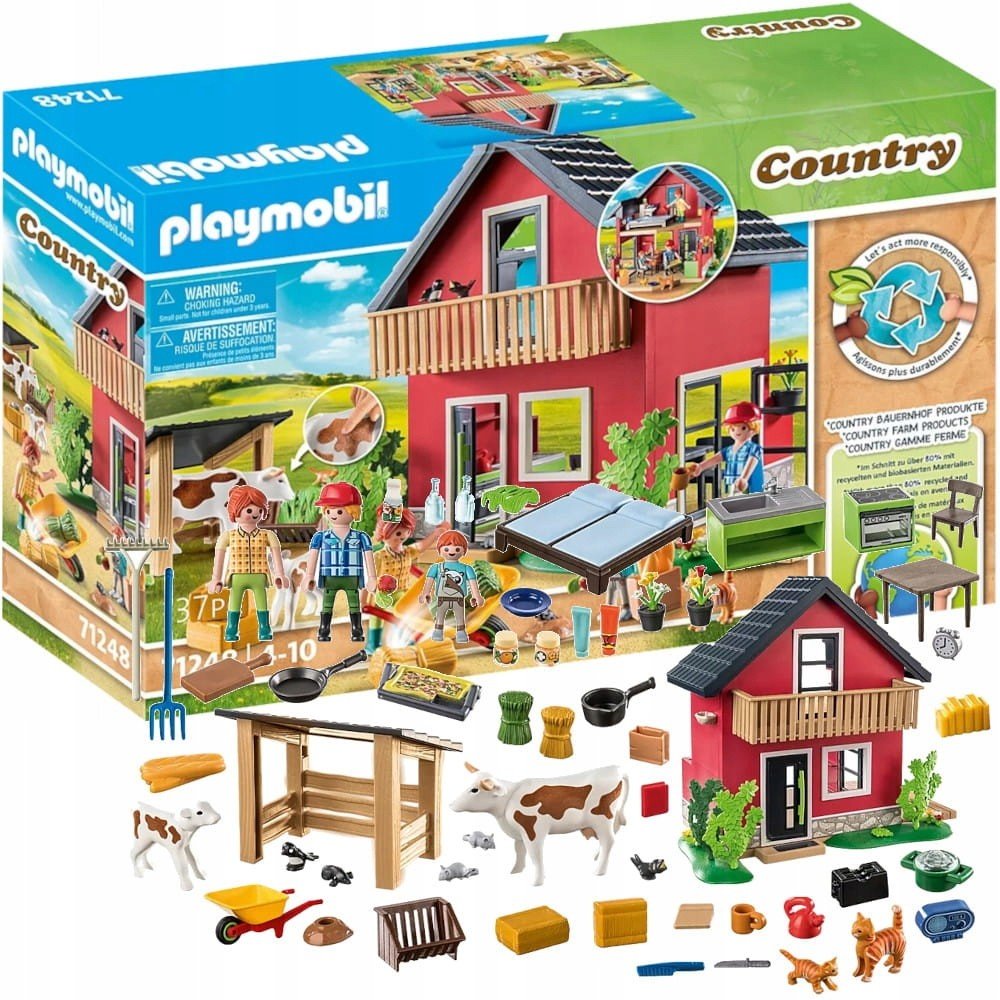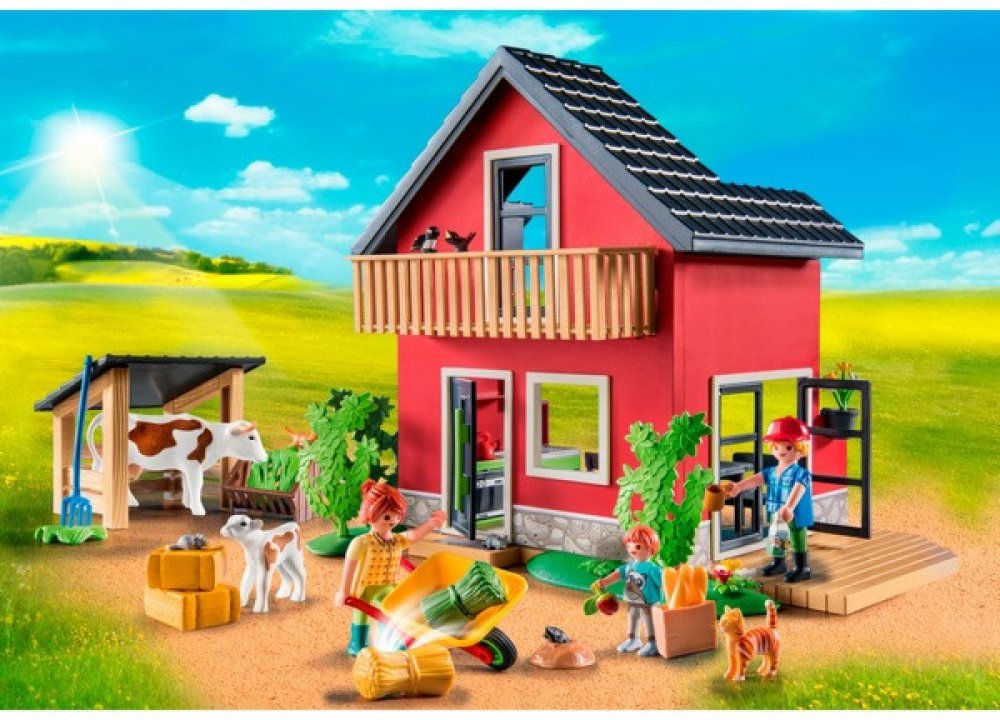Sada PLAYMOBIL obsahuje tři figurky PLAYMOBIL, statek s trávníkem a nábytkem, přístřešek, krávu a tele, krmivo pro zvířata a mnoho dalších doplňků.
