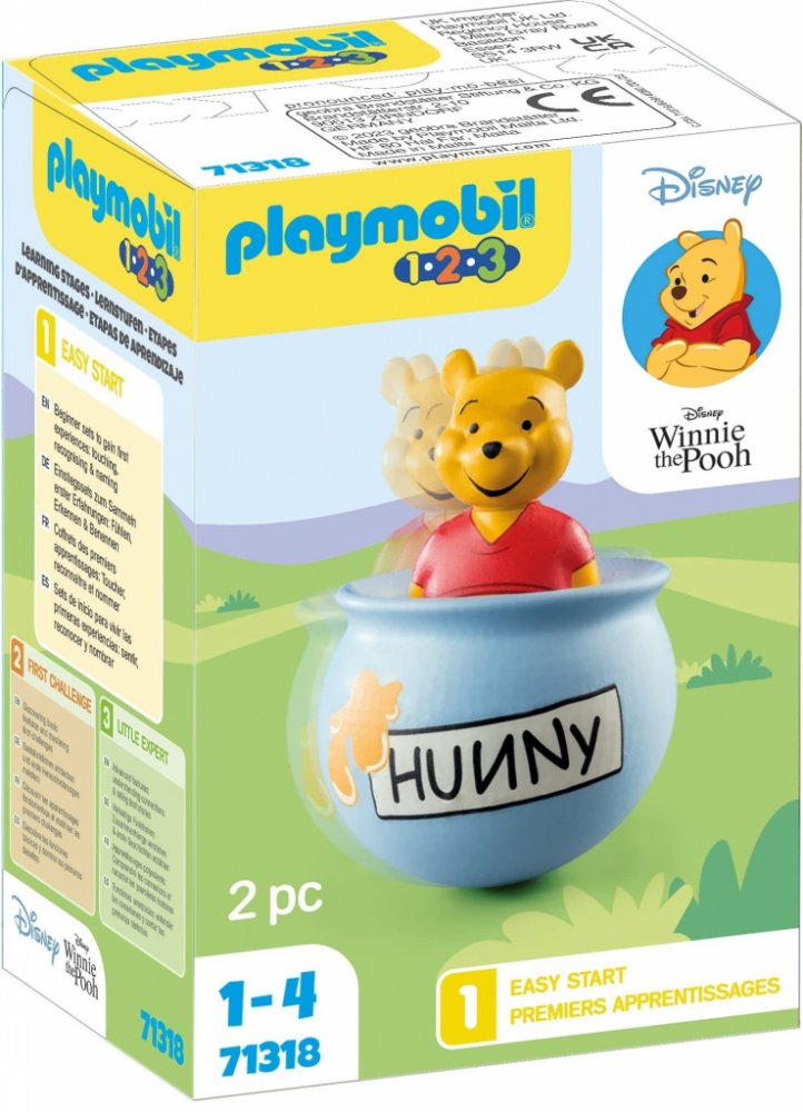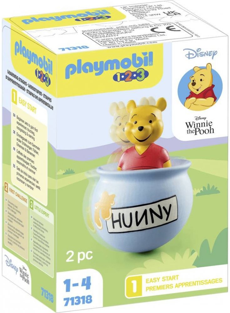 Playmobil 1.2.3 & Disney Medvídek Pú's Honey Pot. Medvídek Pú je startovací sada ze série produktů inspirovaných Medvídkem Pú od Disneyho. Umožňuje procvičovat jemnou motoriku a zároveň rozvíjet kognitivní myšlení. Po pošťouchnutí medovníku se vždy vrátí do vzpřímené polohy, kolébá se tam a zpět.