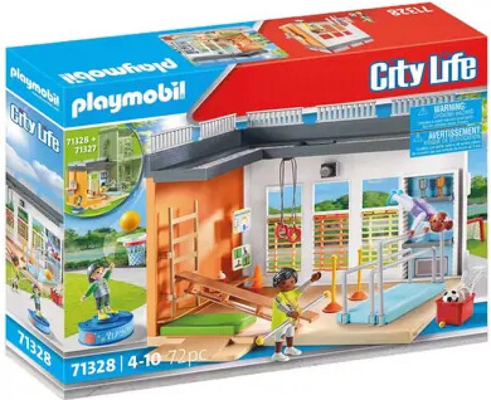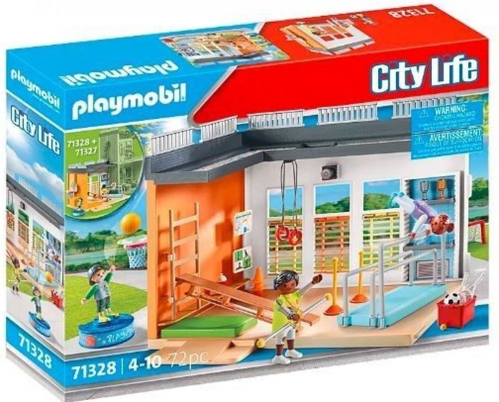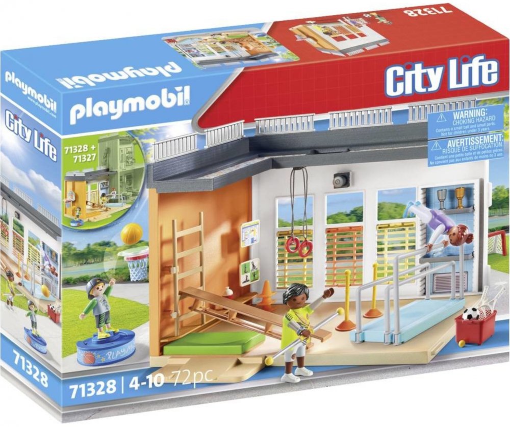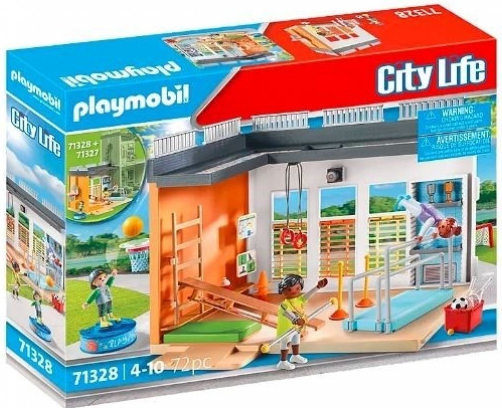 Sport je na programu! Je čas přesunout se ze třídy do tělocvičny. Díky mnoha doplňkům a basketbalovému koši lze ve velké tělocvičně provozovat četné sporty a po skončení sportovní výuky uložit vybavení na určená místa. Rozšíření tělocvičny lze připojit k velké škole (položka 71327 - prodává se samostatně). S touto detailně propracovanou herní sadou PLAYMOBIL se děti od 4 let mohou ponořit do rušného života školy a vymýšlet si vlastní příběhy.