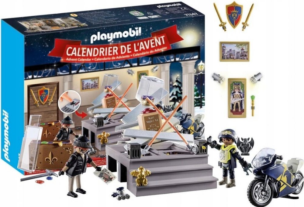 Za malými okénky adventního kalendáře se ukrývají dílky nebo postavičky PLAYMOBIL® na téma policie a chytání lupiče.